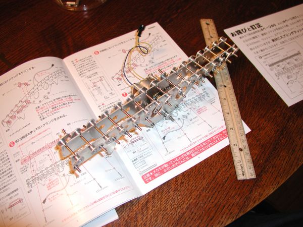 This kit only had directions in Japanese – there was no English version included. Since we had experience with the Inchworm, we decided to see if we could put it together just using the pictures, but we found it helped a lot to look at the English instructions periodically. (If you decide you need the text in English, it’s available as a PDF through the Maker Shed Centipede link – you do need to download the Japanese font to view any text at all, even the English, which is odd, but it only took a minute.) There was an errata page in the kit that had corrections for steps 5 and 7, but the errata page looked the same as the page in the Japanese instructions. The online illustrations for steps 5 and 7 were missing some little spring washers, so we assumed the kit had come with updated instructions.