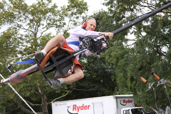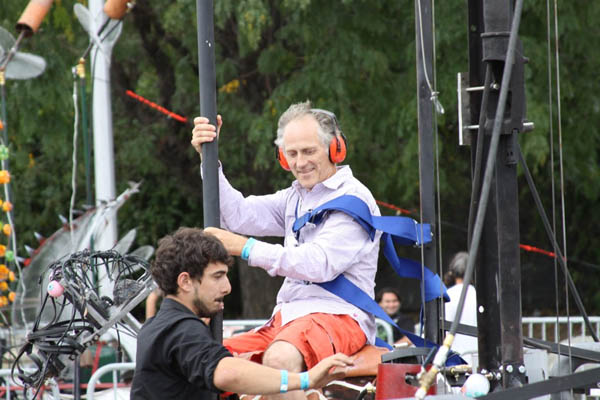 This ride, built by the dastardly danger-hackers at the Madagascar Institute, scares the daylights out of me. But some men are braver than I am. Like Tim O’Reilly (yes, that Tim O’Reilly) who didn’t seem too apprehensive about straddling a pulse jet welded to a glorified swing set. I don’t know about him, but my heart is still racing!