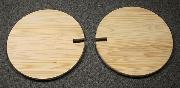 A “wobbler” consists of two intersecting circles in perpendicular planes. When you roll it along the ground, it wobbles left and right as it moves forward. I saw these 18″ diameter pine disks for sale at a lumber store and thought they would make a wonderfully large wobbler.