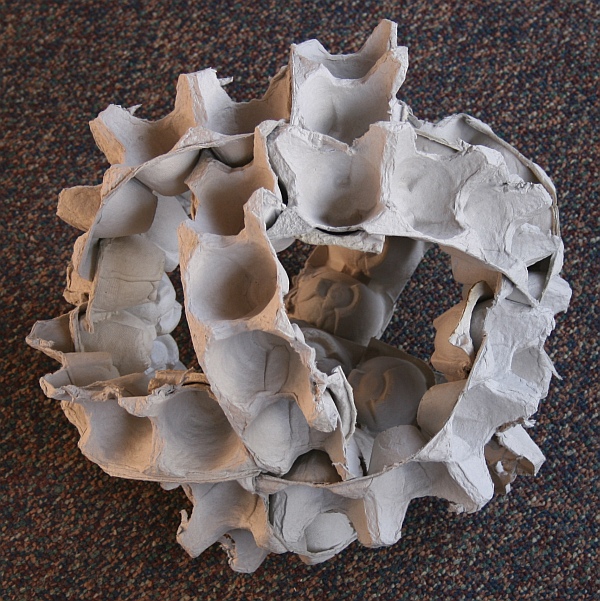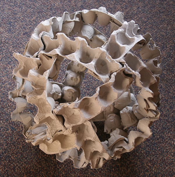 Save your egg cartons and see what recycled art you can make with them! You can cut the bottoms of egg cartons into strips of six “waffle holes” which then interlock, without glue, into interesting structures. The basic joint of four spiraling strips is seen below. The end of each locks under the adjacent waffle hole of the next, always keeping a consistent handedness. This cuboctahedron is made from a dozen cartons. A gross of eggs provided the sustenance for me to arrange the twenty-four strips so that at each joint, in cyclic order, the openings are of the form: square, triangle, square, triangle.