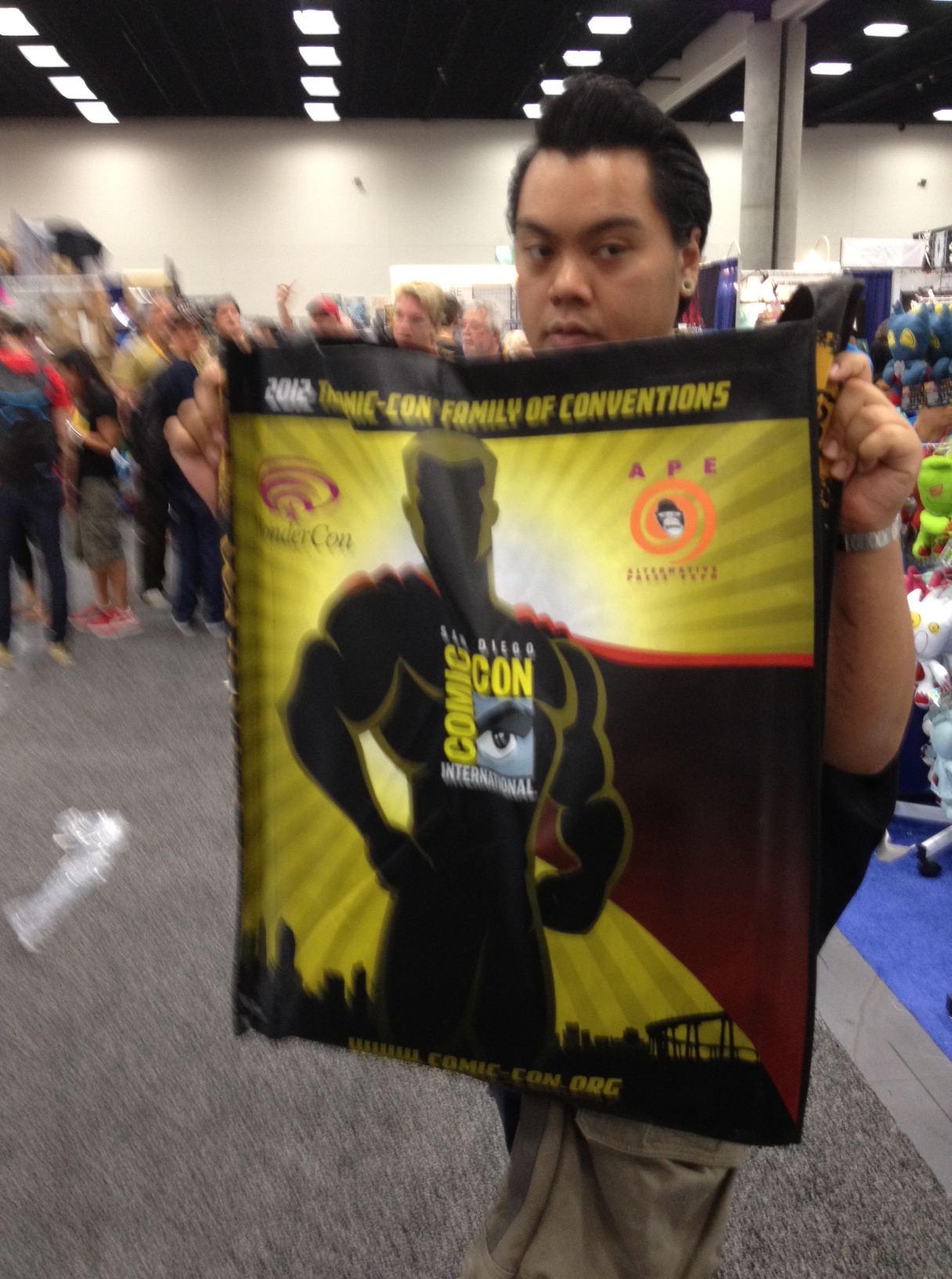 Once you see all of the swag that’s floating through this place (entire forests must have been felled in the name of the new Batman movie and The Walking Dead), you understand the need for the absurdly large swag bags. I didn’t understand them until I asked some folks who were carrying them. They have tubular compartments in them for posters. And then, of course, large flat art, and the aforementioned swag-o-ganza: free comic books, blank journals, postcards, DVDs, figurines, buttons, badges, pens, T-shirts, and the rest of it.