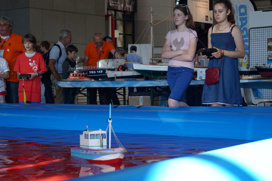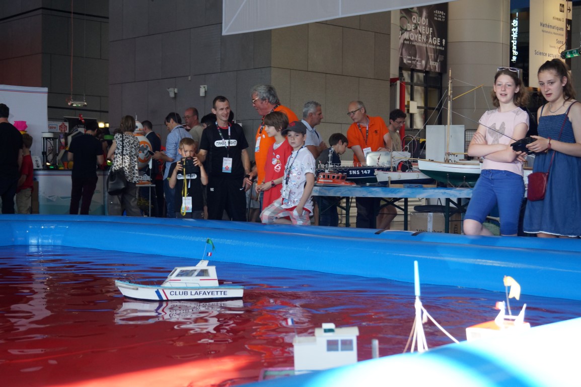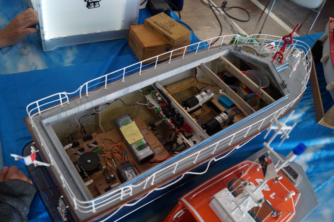 Several radio controlled boats putt around a large pool. Kids are taking turns driving them around and often crashing into eachother. There are several boat groups here, some that focus on detailed recreations and some that look like they’re focused more on performance.