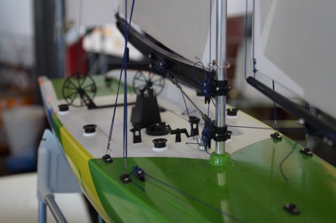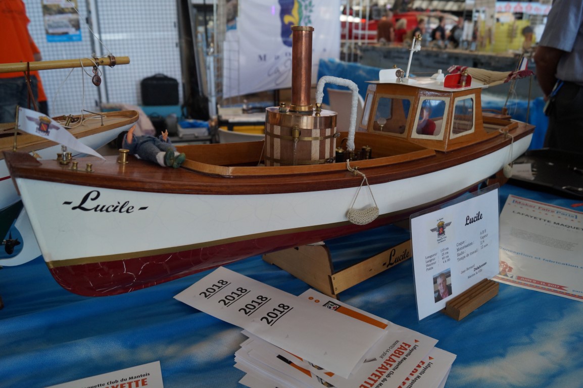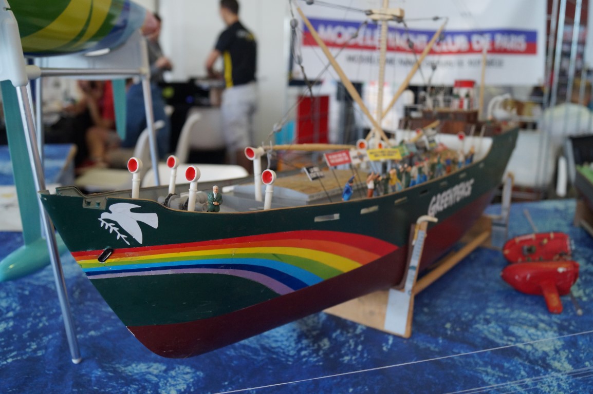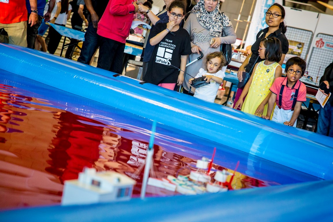 Several radio controlled boats putt around a large pool. Kids are taking turns driving them around and often crashing into eachother. There are several boat groups here, some that focus on detailed recreations and some that look like they’re focused more on performance.