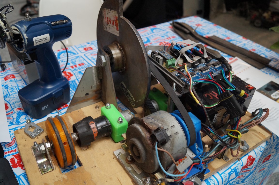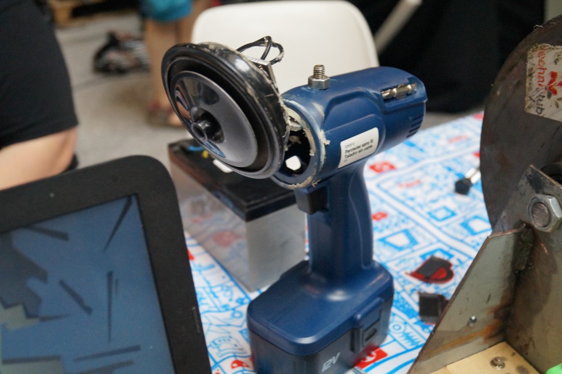 Most of the drive parts are salvaged from cordless drills. Interestingly they reused the body and trigger of one as a horn as you can see below.