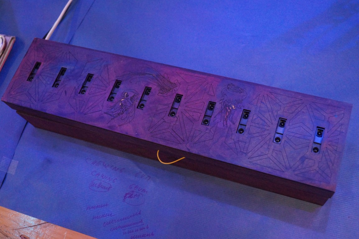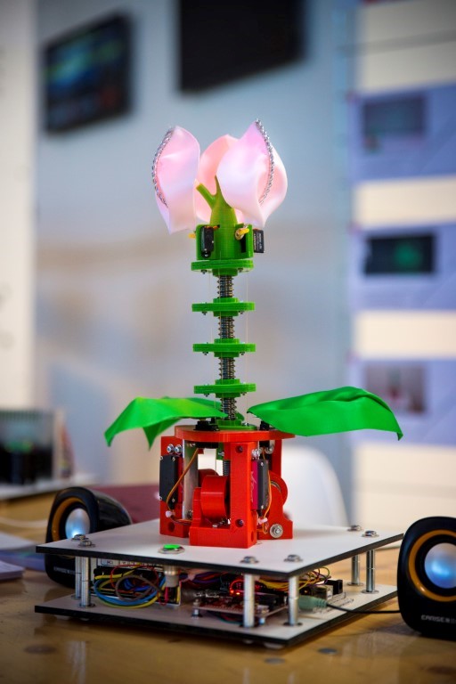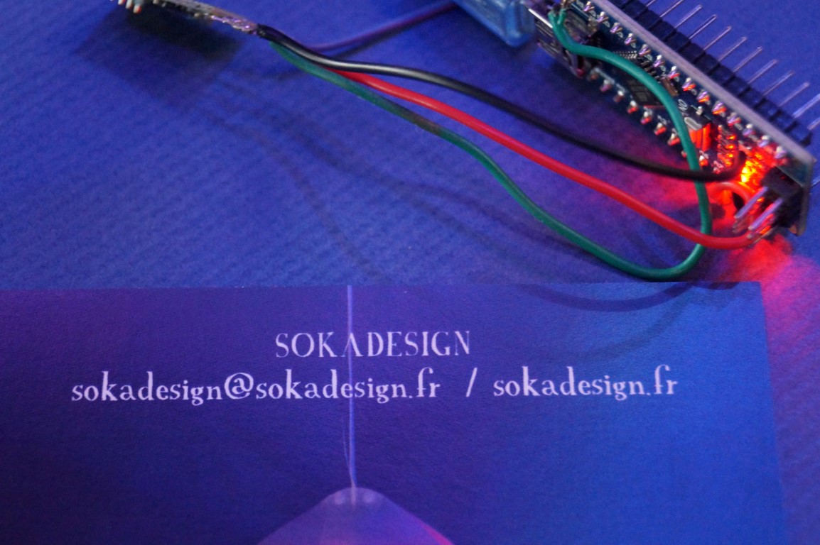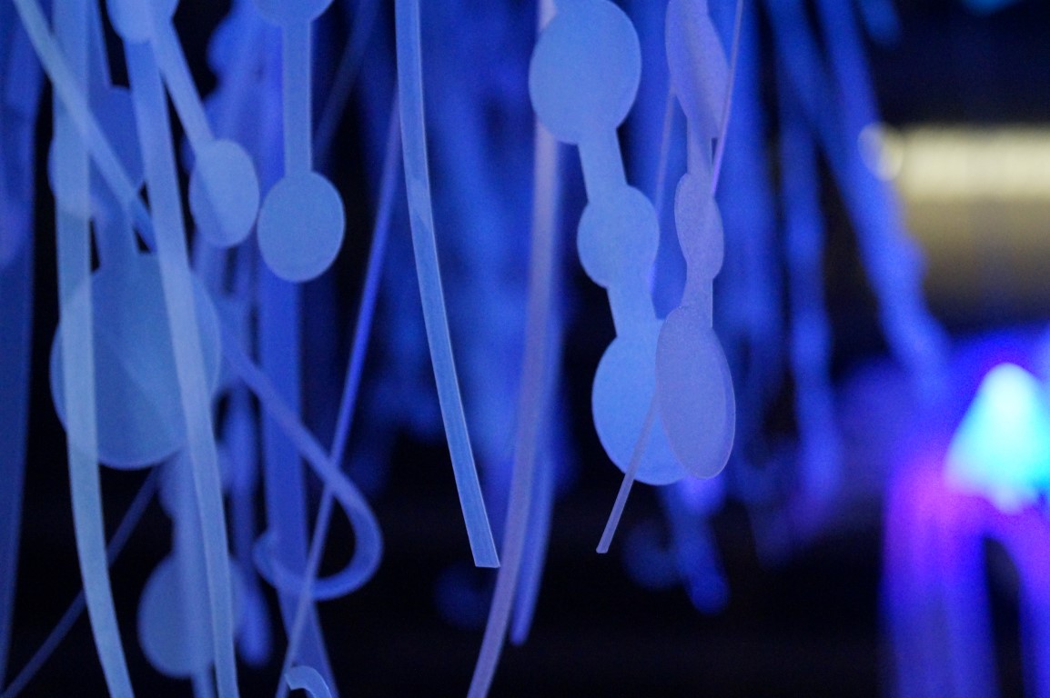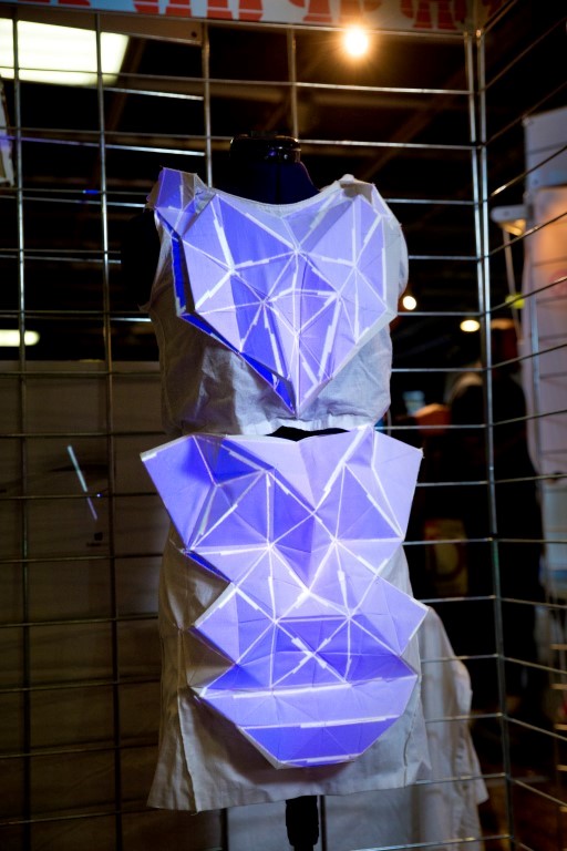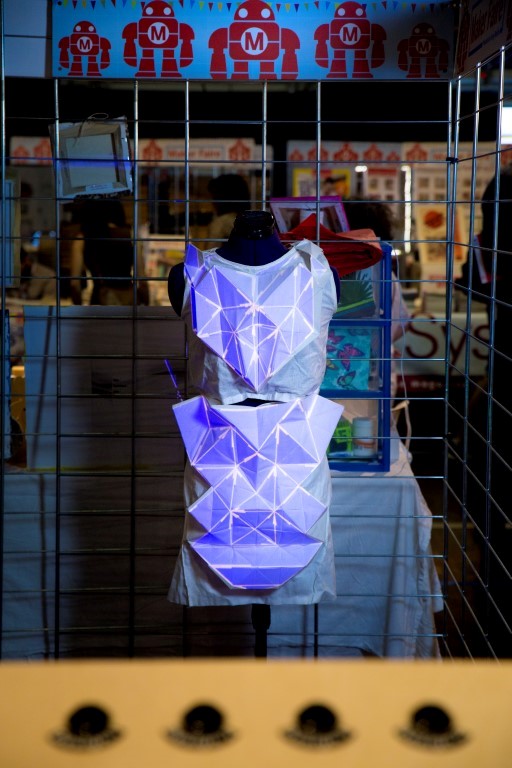 These jelly fish caught my eye from quite far away. As I stood and watched, I noticed that they would change color as the artist waived her hand over a box on the desk. Upon further inspection, there were IR proximity sensors there.
