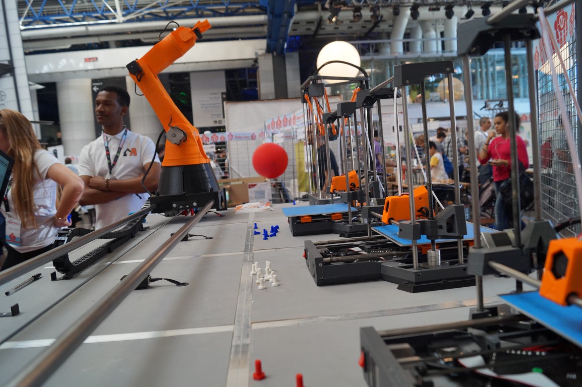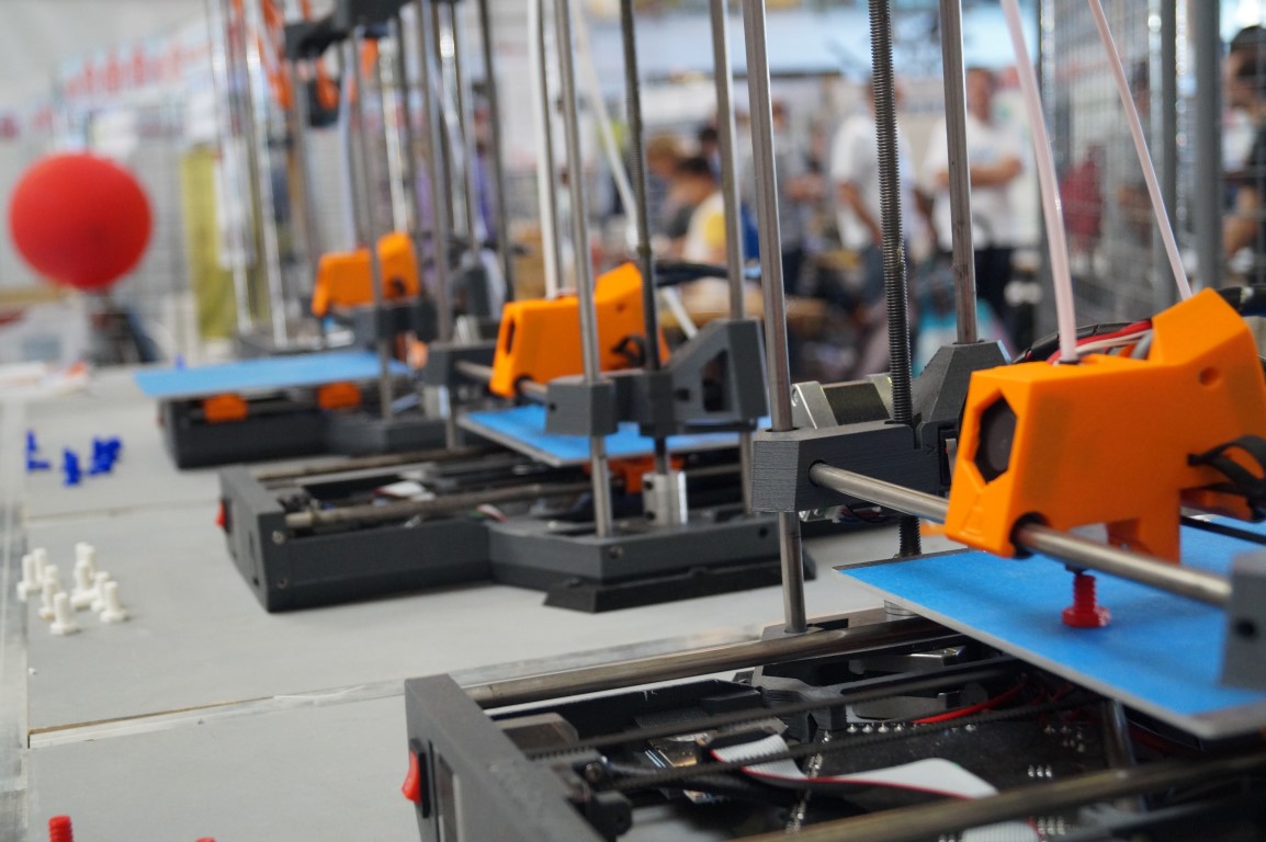 Pulling completed parts from 3D printers with @mrobot #MFP17 pic.twitter.com/1XFiivzEgz