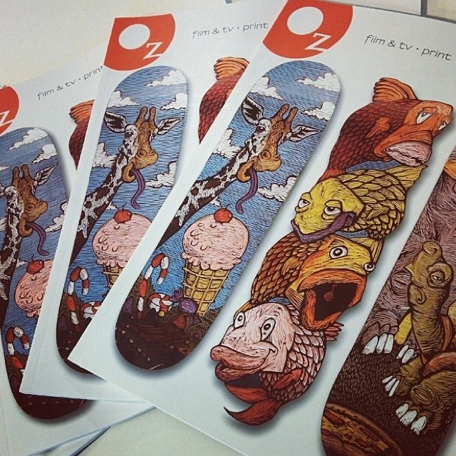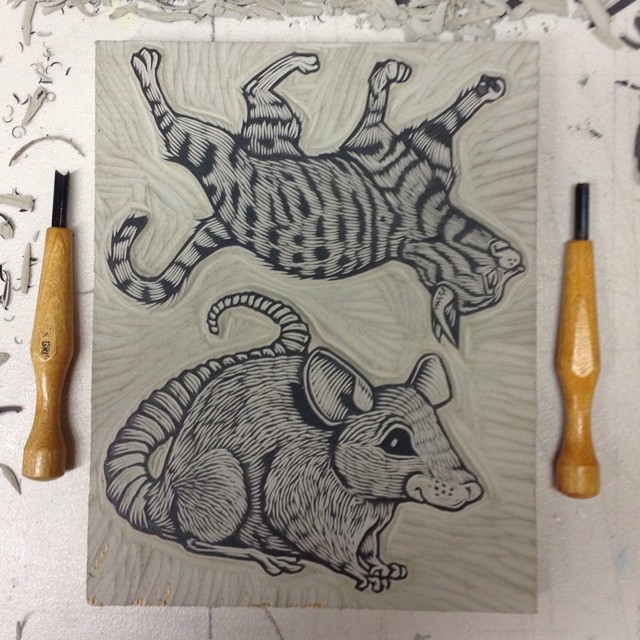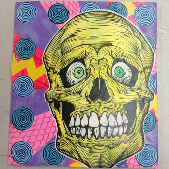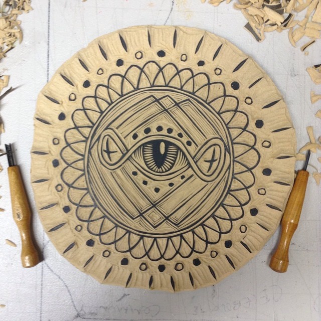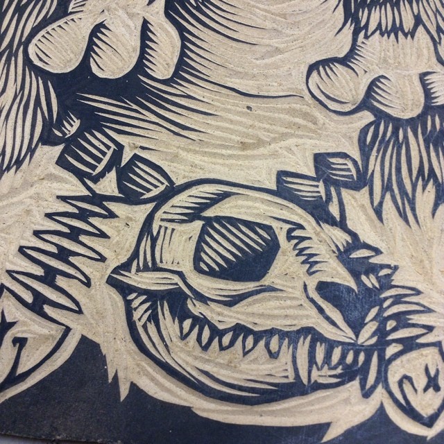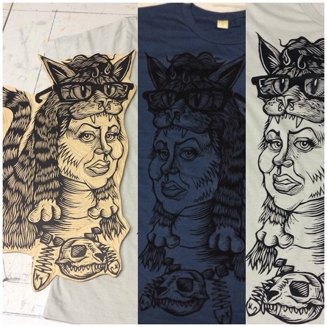 Judging from the examples of his work that can be found on his site, that is a pretty accurate description. Chris, who operates as Noosh Studios, hand carves wood blocks that are then used like a giant stamp to create t-shirts, stickers, and prints.