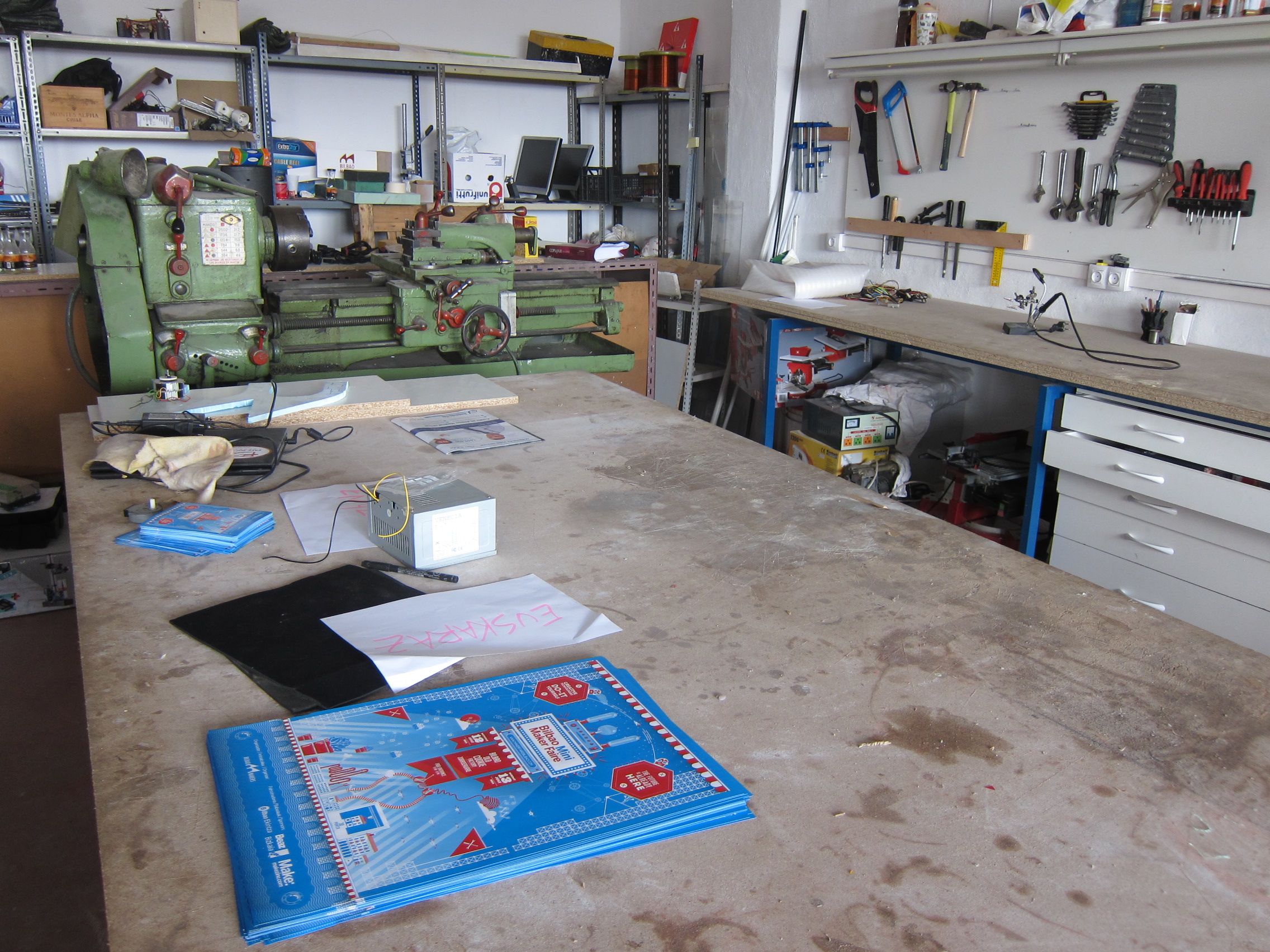 - Maker Faire posters on the shop table