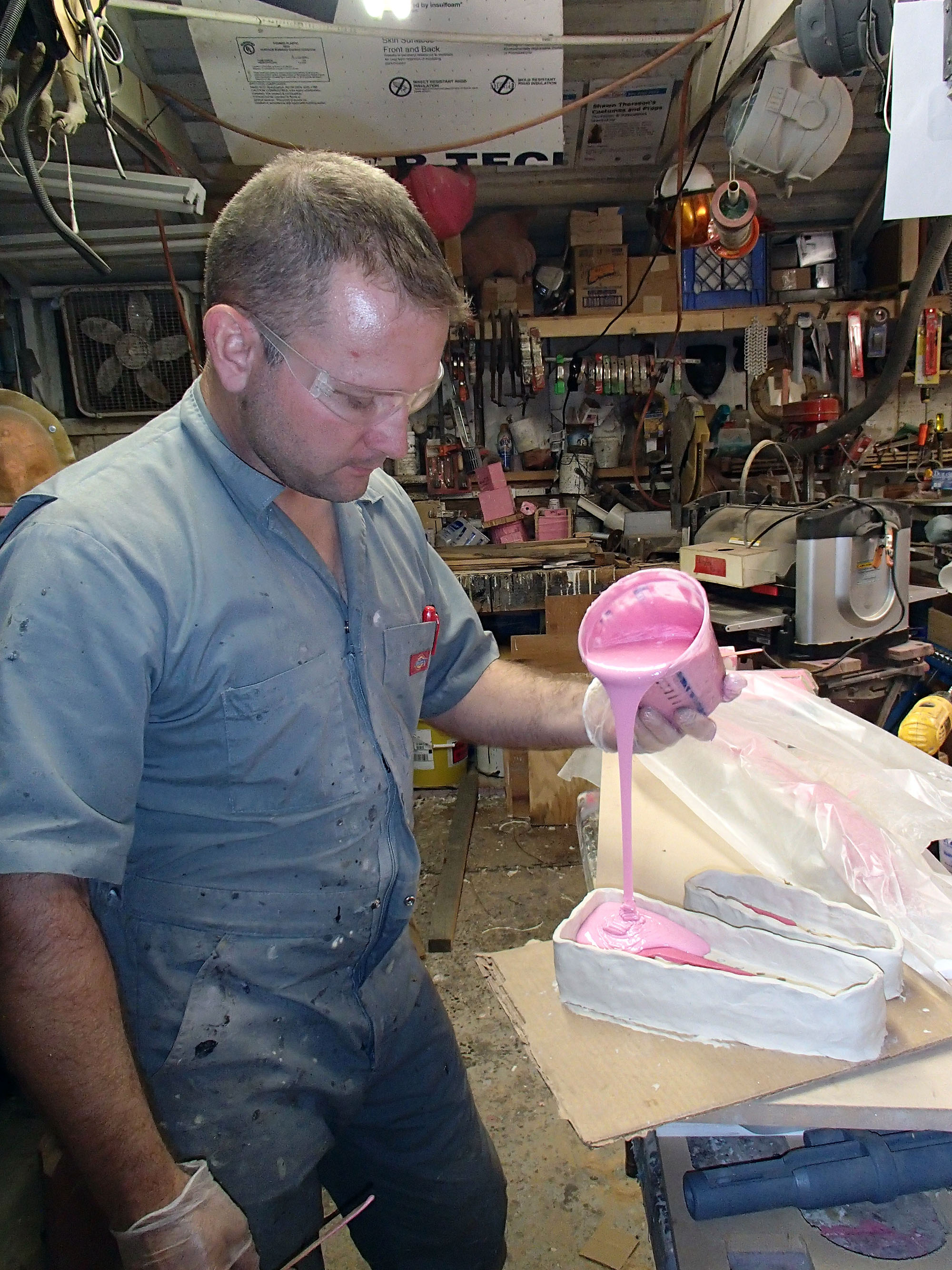 The main body was sanded veryย near to smooth. Shawn made molds of all the different parts and laid down a fiberglass mothermold one half,ย then flipping the whole thing over and startedย the rubber jacket mold for the other side. These will be 2-part block molds in silicone rubber.