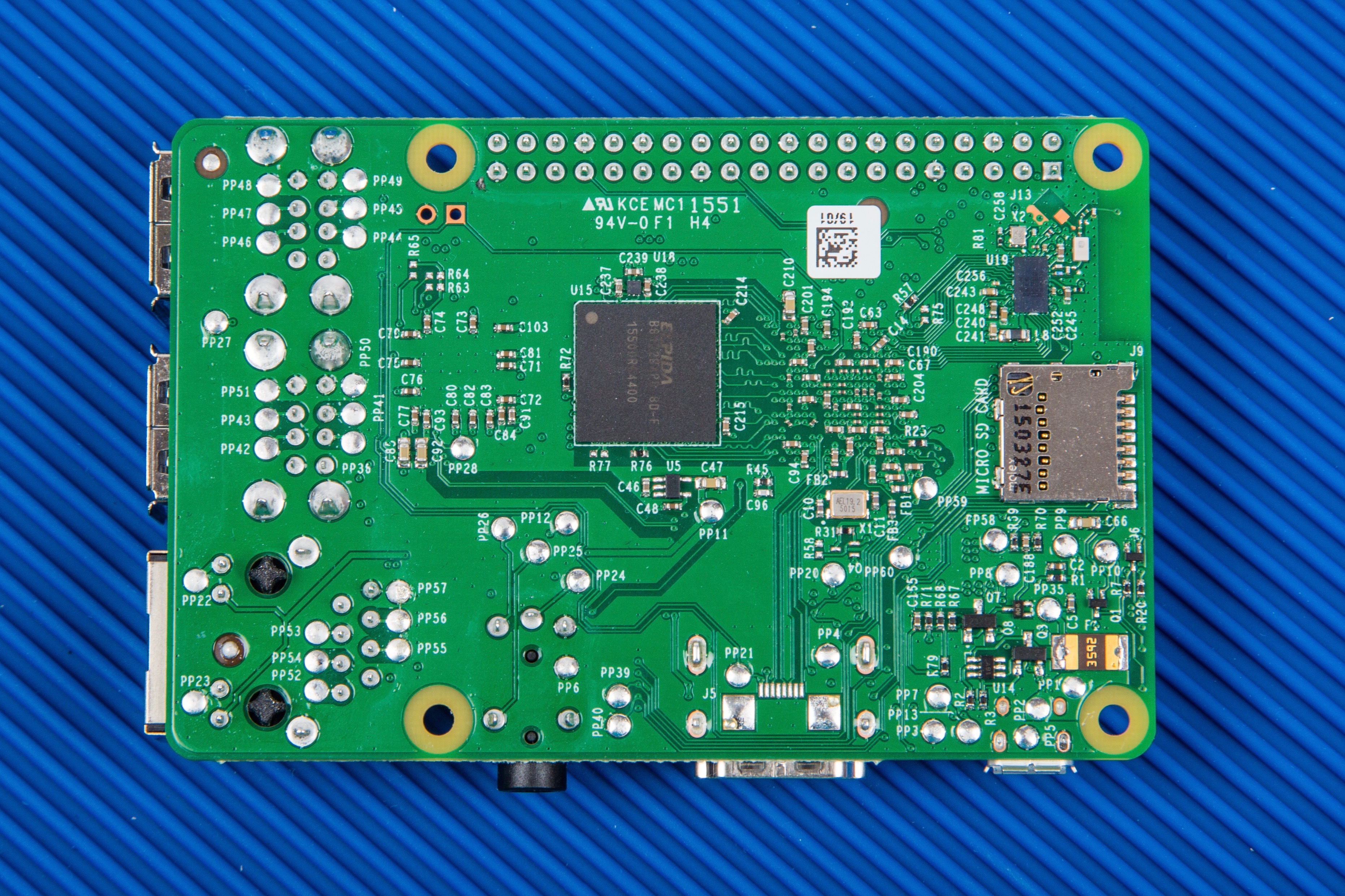 The front side of the new Raspberry Pi 3 with Broadcom BCM2837 system‐on‐chip (centre left) and SMSC LAN9514 USB/Ethernet controller (right).