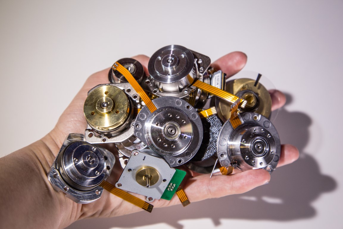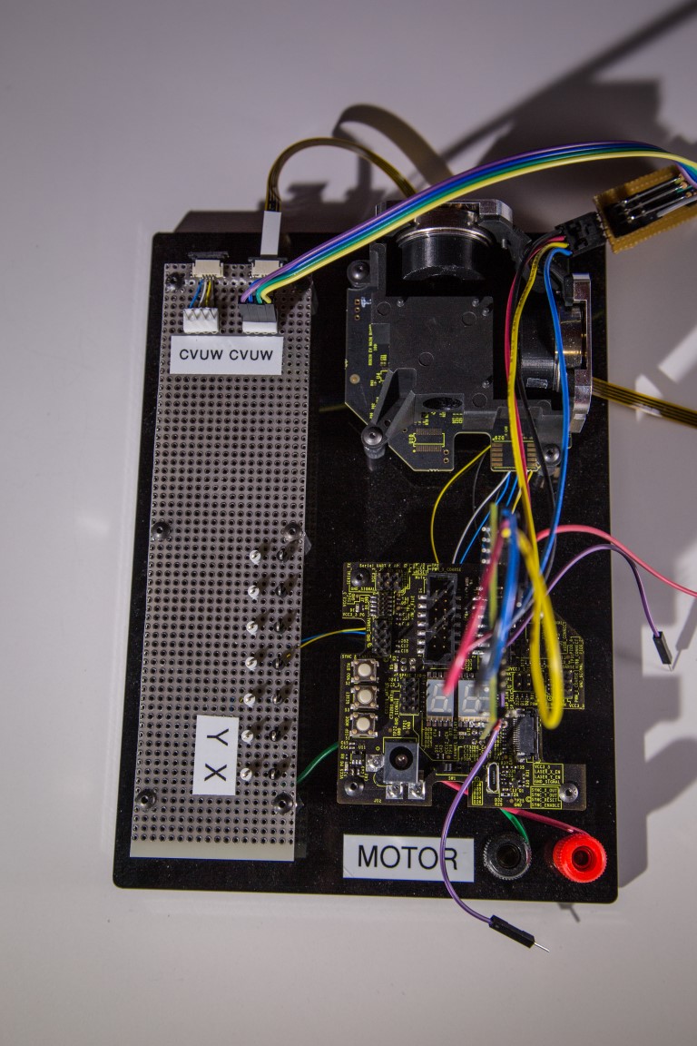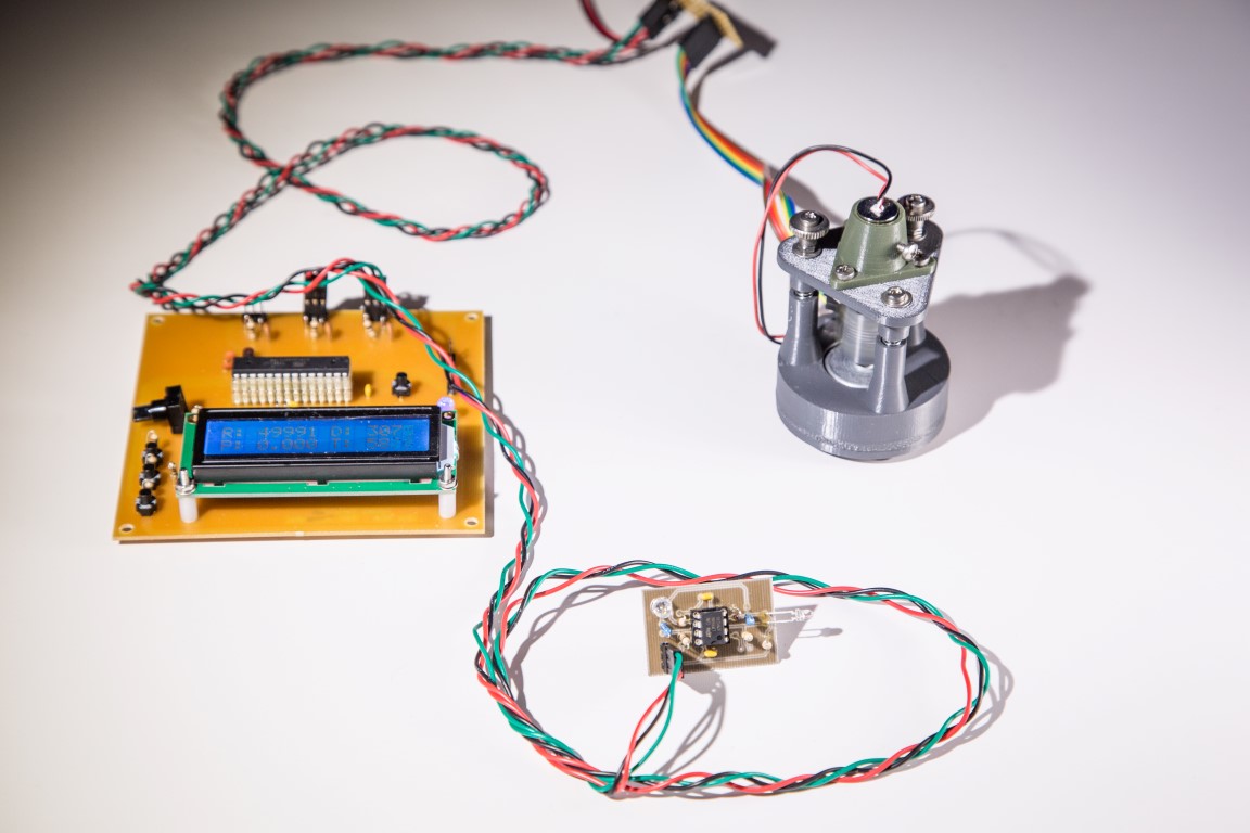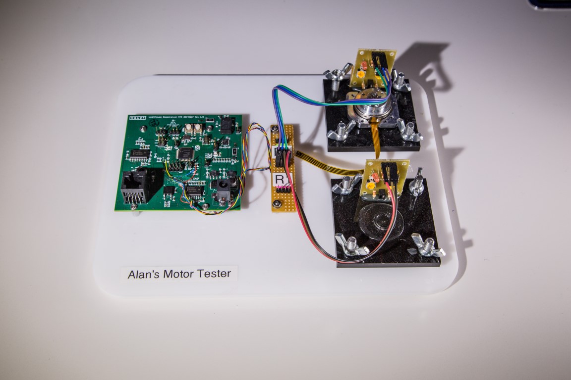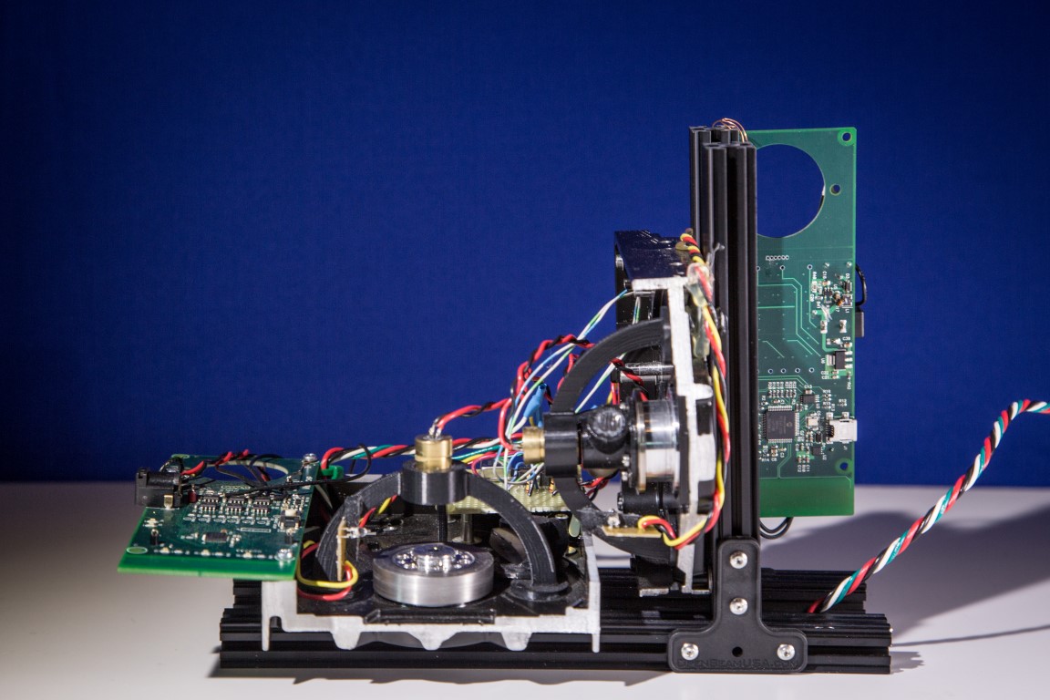 The lighthouse base station sends a fanned-out laser beam across your room over and over. The best way to do this is with a rotating system. This prototype uses a pair of hard drives sawed in half. Hard drive motors are very reliable for long term spinning, and a convenient item to prototype with.