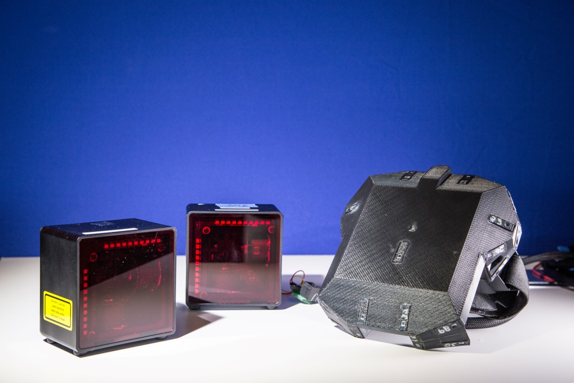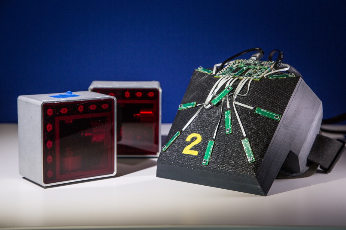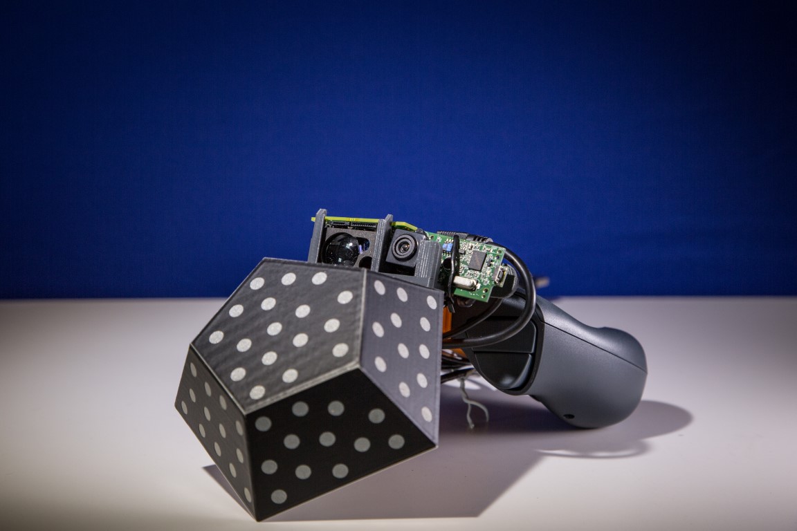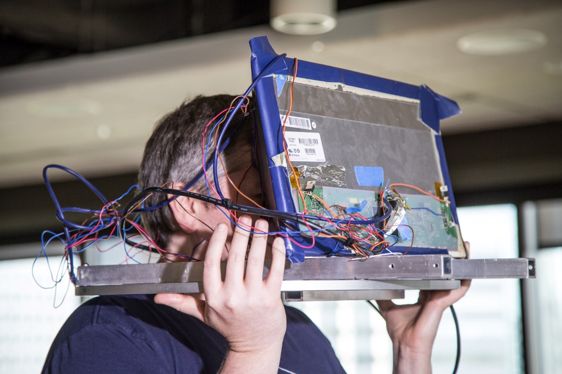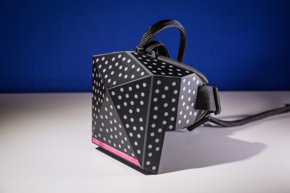 This is the prototype headset that used the fiducial trackers you saw above. Note the little camera mounted on it. You can also clearly see that it utilizes two screens in portrait mode.