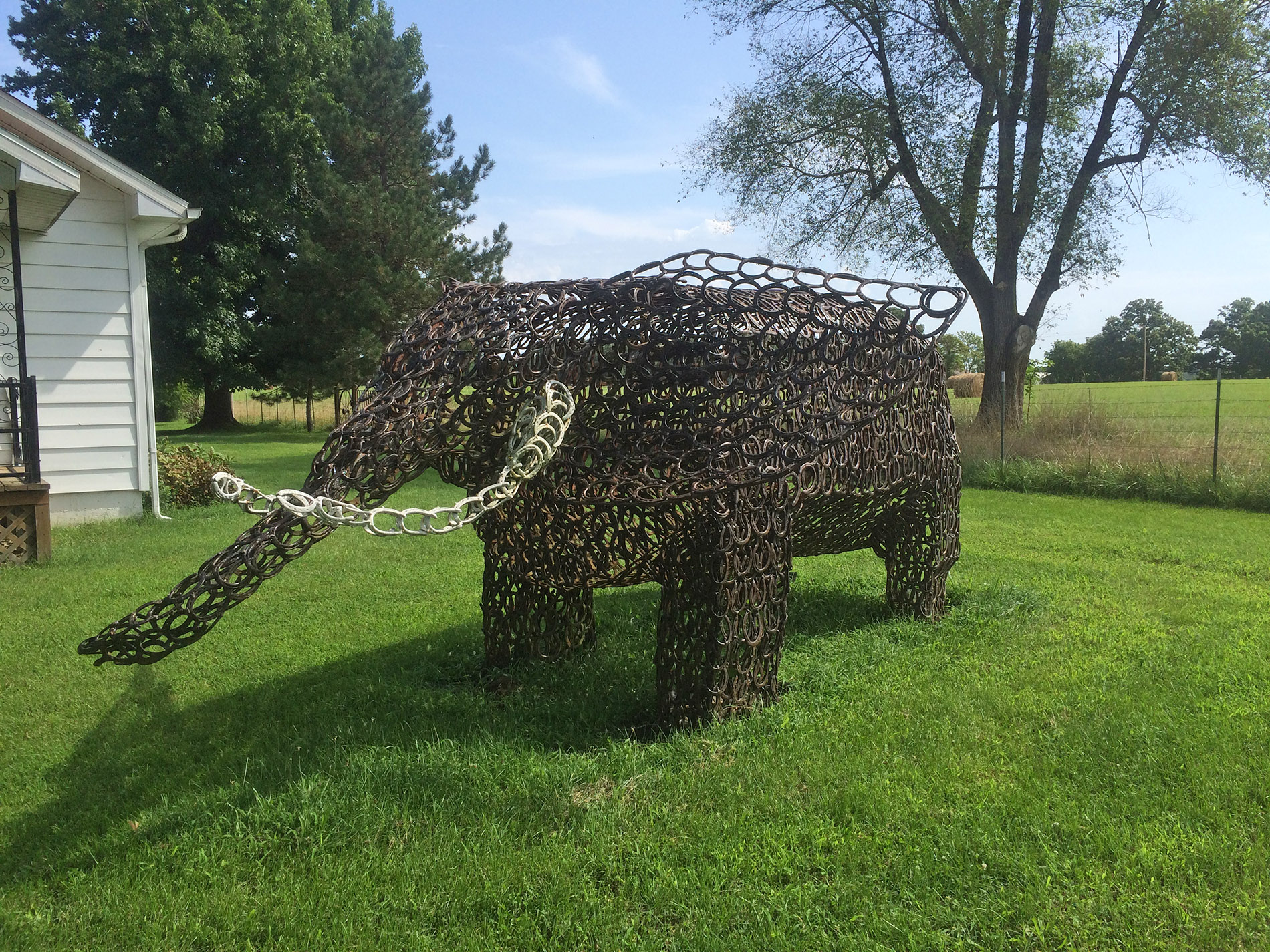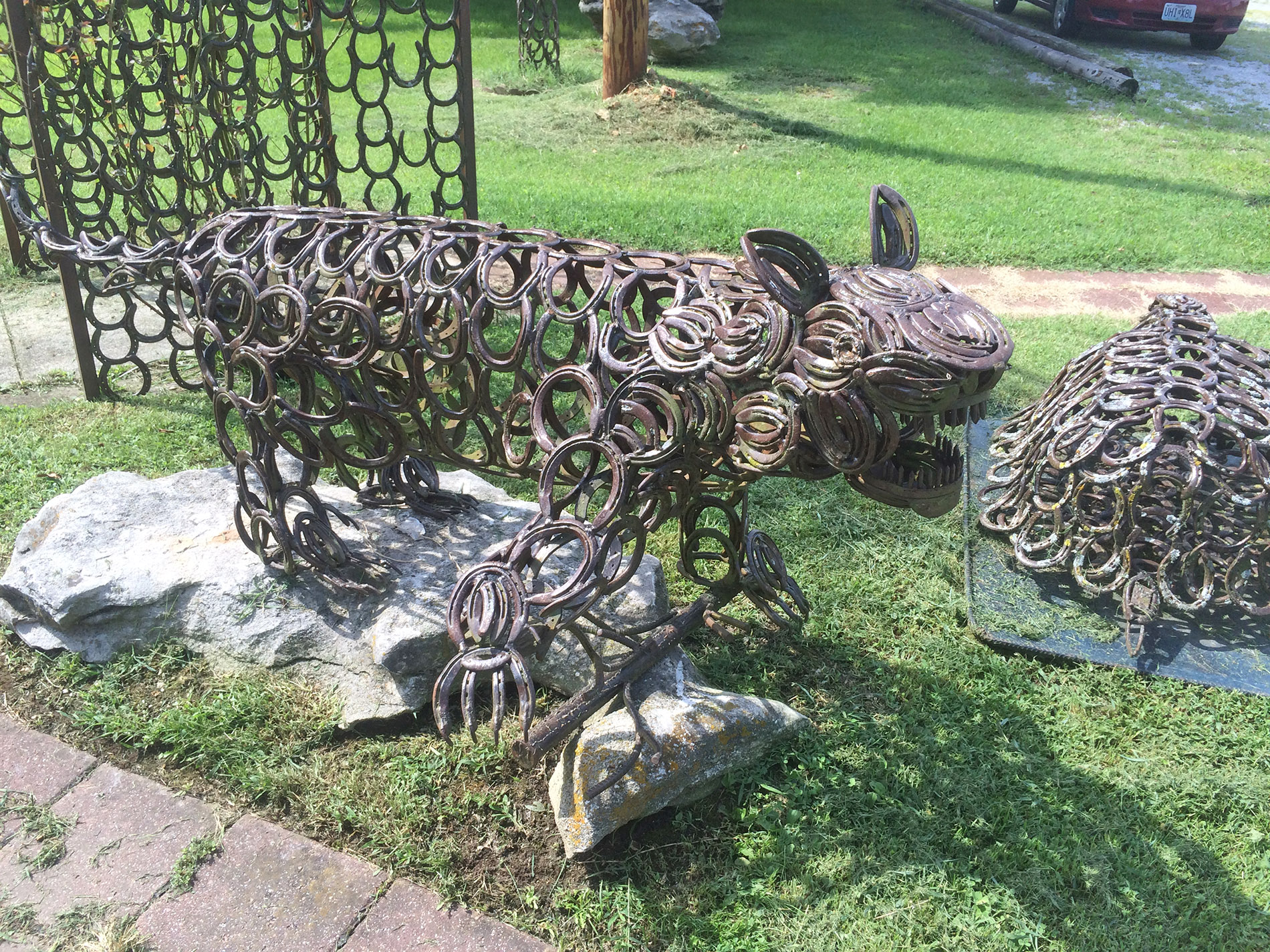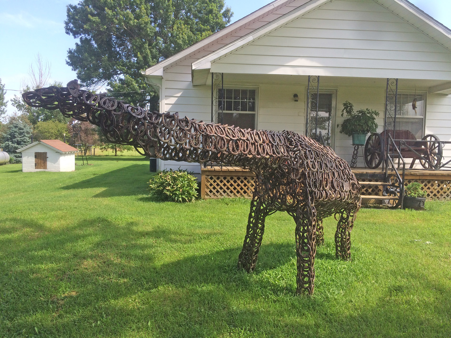 I was driving down a fairly small road in the middle of southern Missouri (near Marshfield) this morning and something caught my eye. There was a giant sculpture of a rhinoceros made entirely out of horseshoes! As I craned my neck to see what was going on, I caught a glimpse of an entire collection of random creatures and forms, lurking in the garden of a small home in the country.