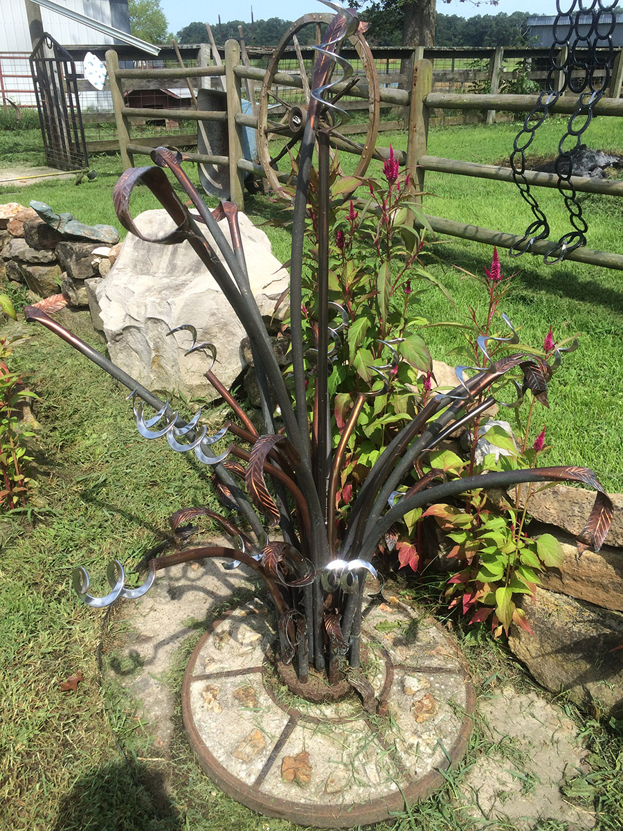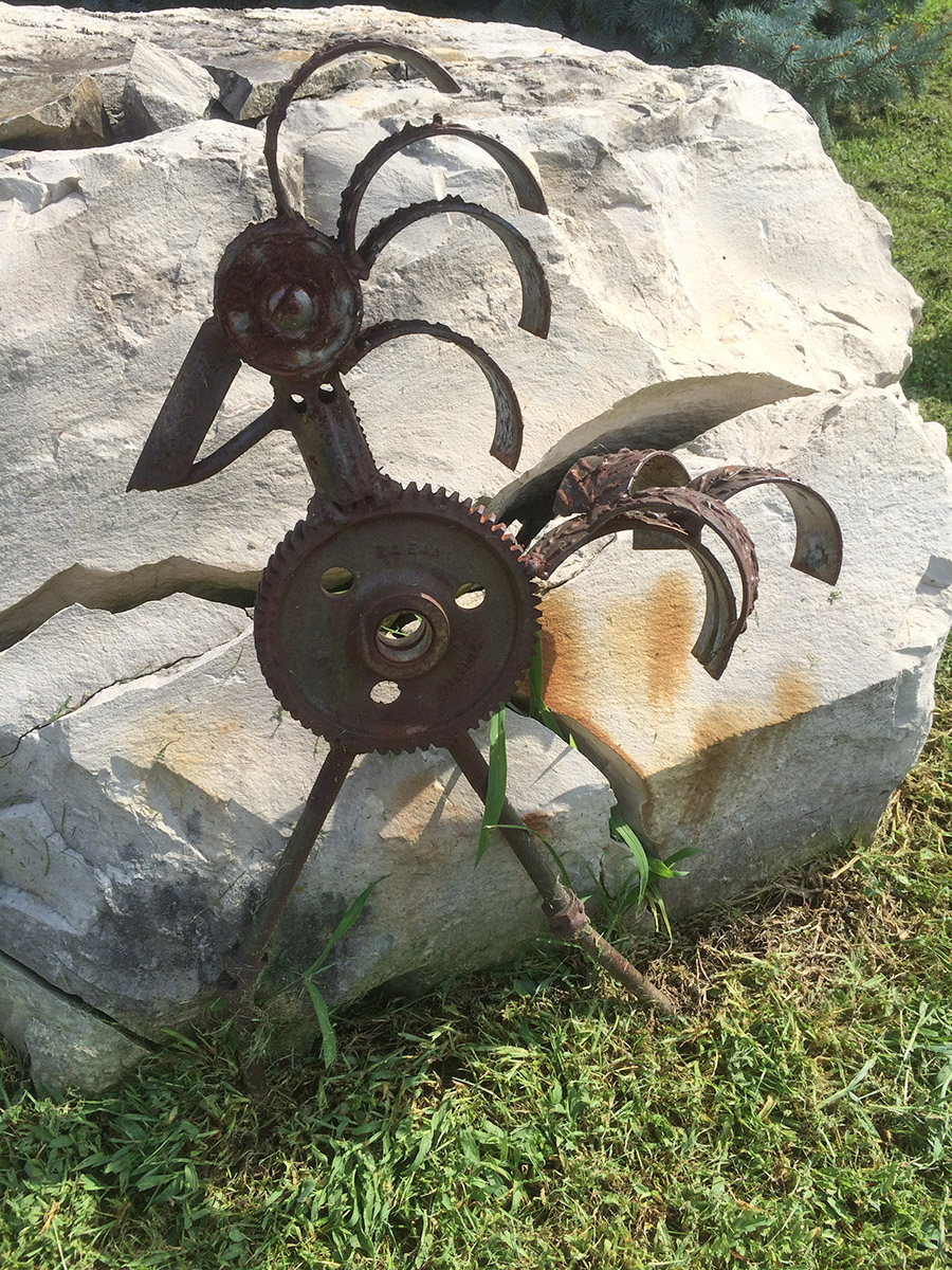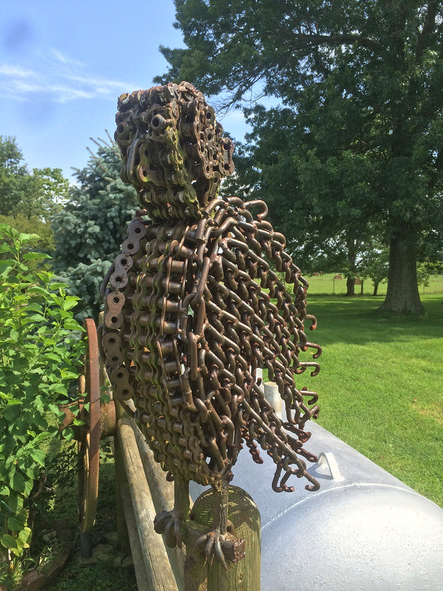 I was driving down a fairly small road in the middle of southern Missouri (near Marshfield) this morning and something caught my eye. There was a giant sculpture of a rhinoceros made entirely out of horseshoes! As I craned my neck to see what was going on, I caught a glimpse of an entire collection of random creatures and forms, lurking in the garden of a small home in the country.