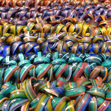 “Gentle Groove,” a current exhibition by artist Angela Teng, presents work that cleverly blurs the line between traditional painting and crafting. She does this by turning acrylic paint into colorful strands that she is then able to crochet like yarn into abstract wall-hanging pieces.