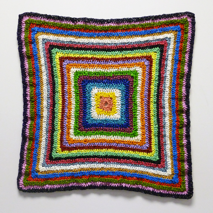 The images in the slideshow below illustrate the various iterations that Teng has gone through in order to blend painting with crochet in unorthodox ways, including painting onto crocheted fabric as well as weaving thick layers of paint on top of canvas.