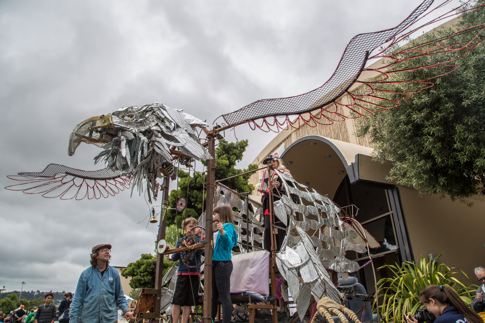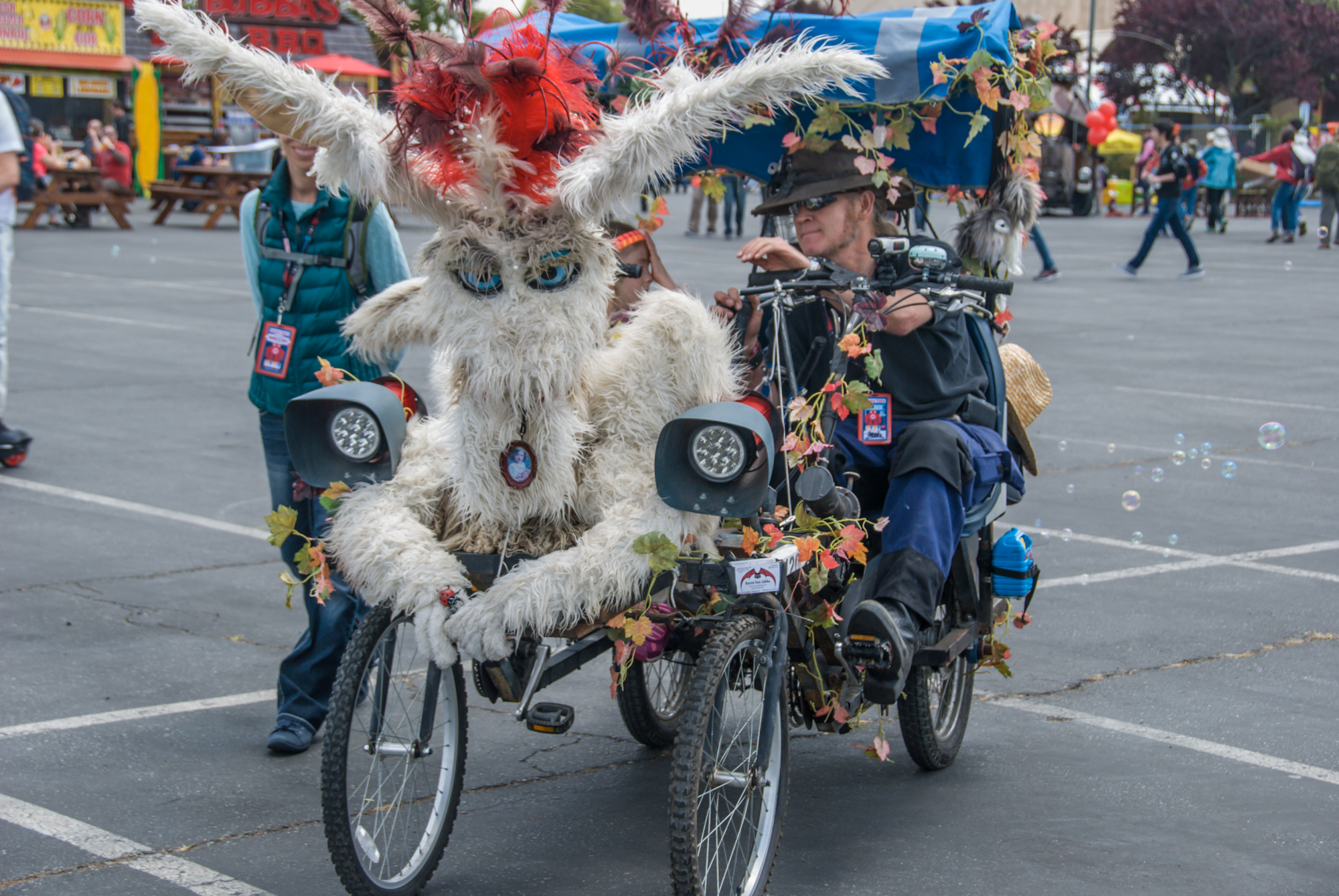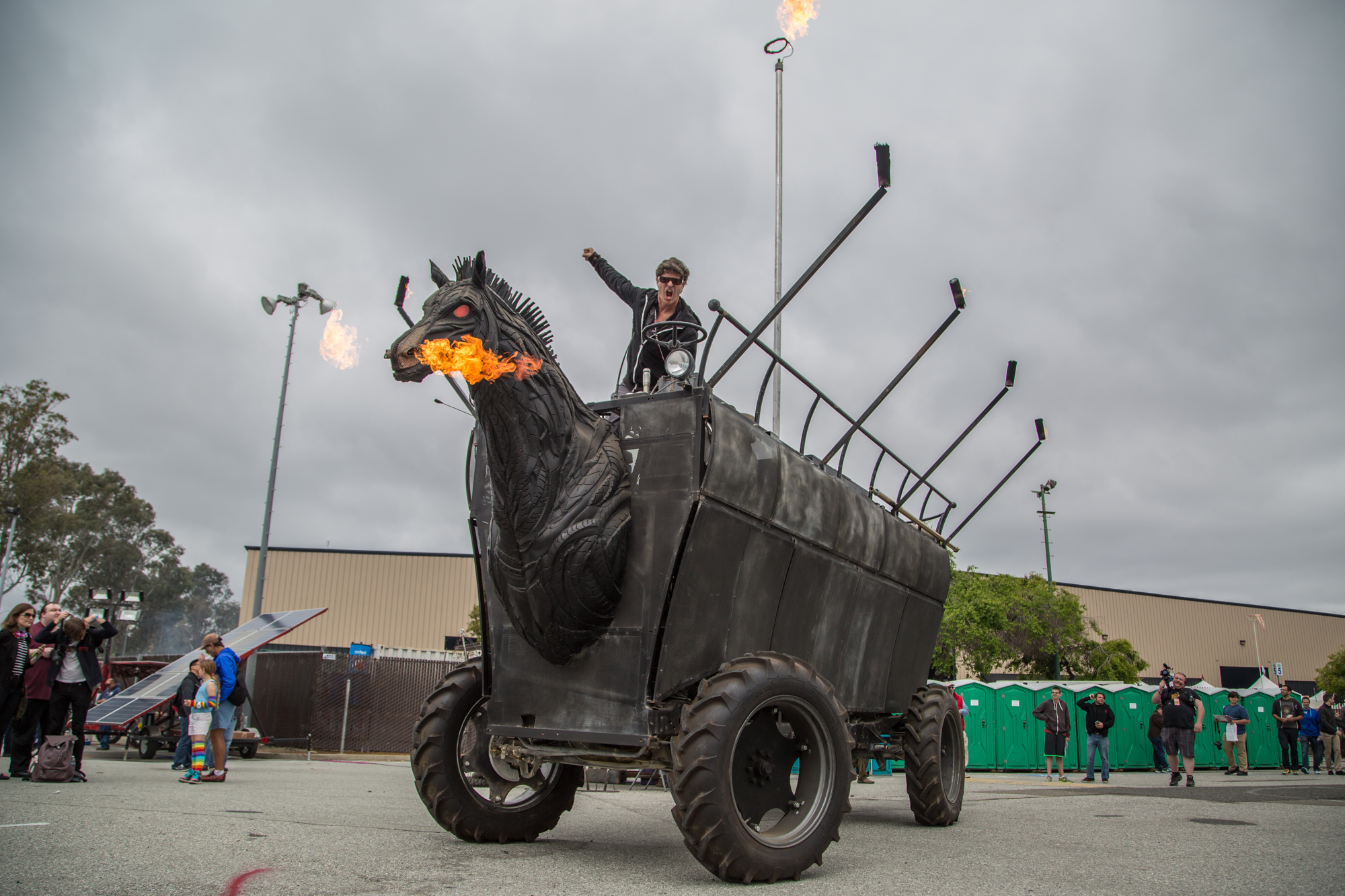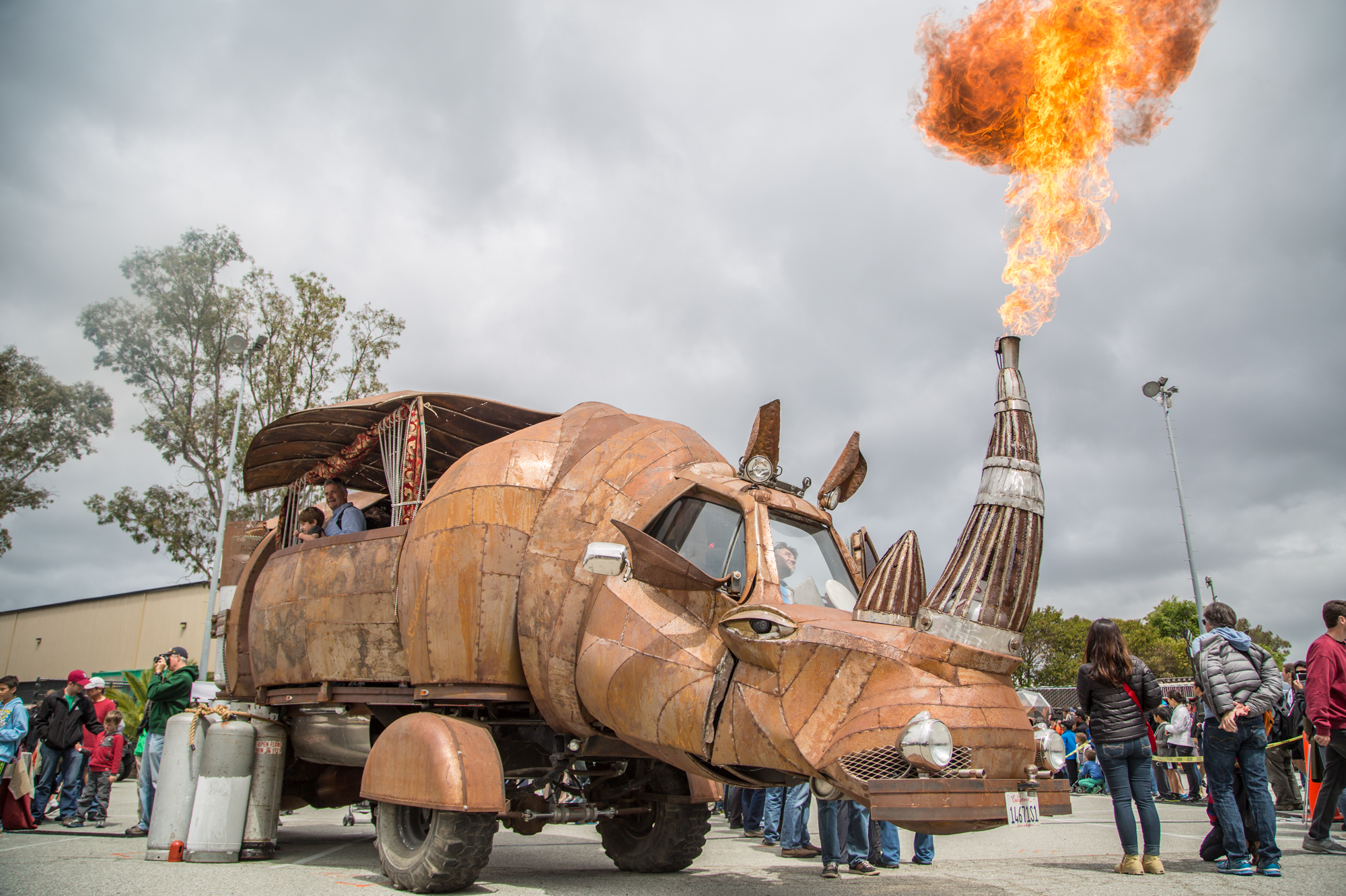 Smaller vehicles whizzed through the crowds while some hulking behemoths sat in the South Lot, spewing fire and music from their innards. Finely polished hot rods. Electric baked goods. Animal shaped, steampunk inspired, scrap metal made, graffitied, puppeteered, the list goes on and on.