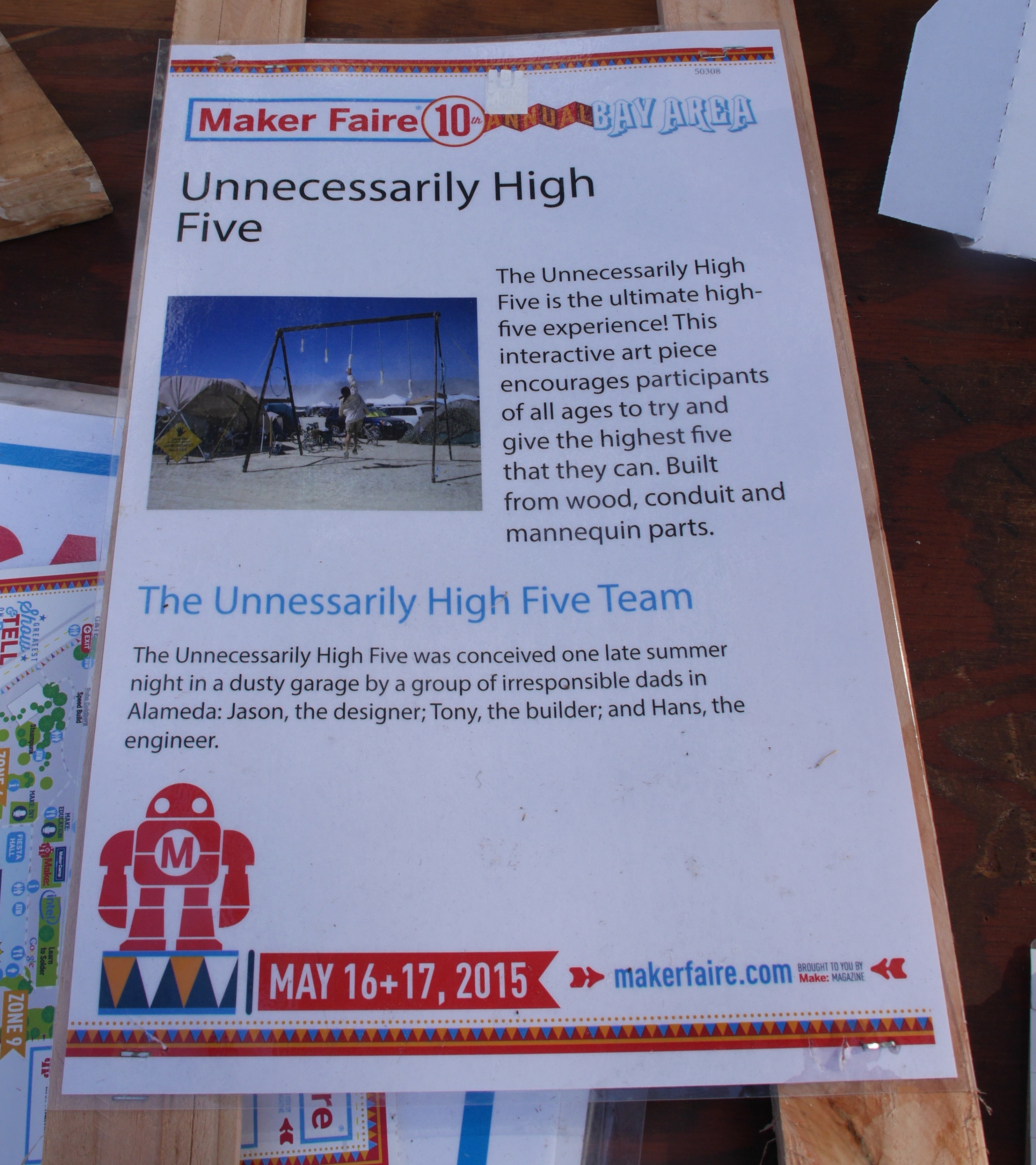 From there the group sourced flat-palmed mannequin arms and built a scaled high-five device. The apparatus first debuted at Burning Man, but they have been showcasing it at Maker Faire ever since.