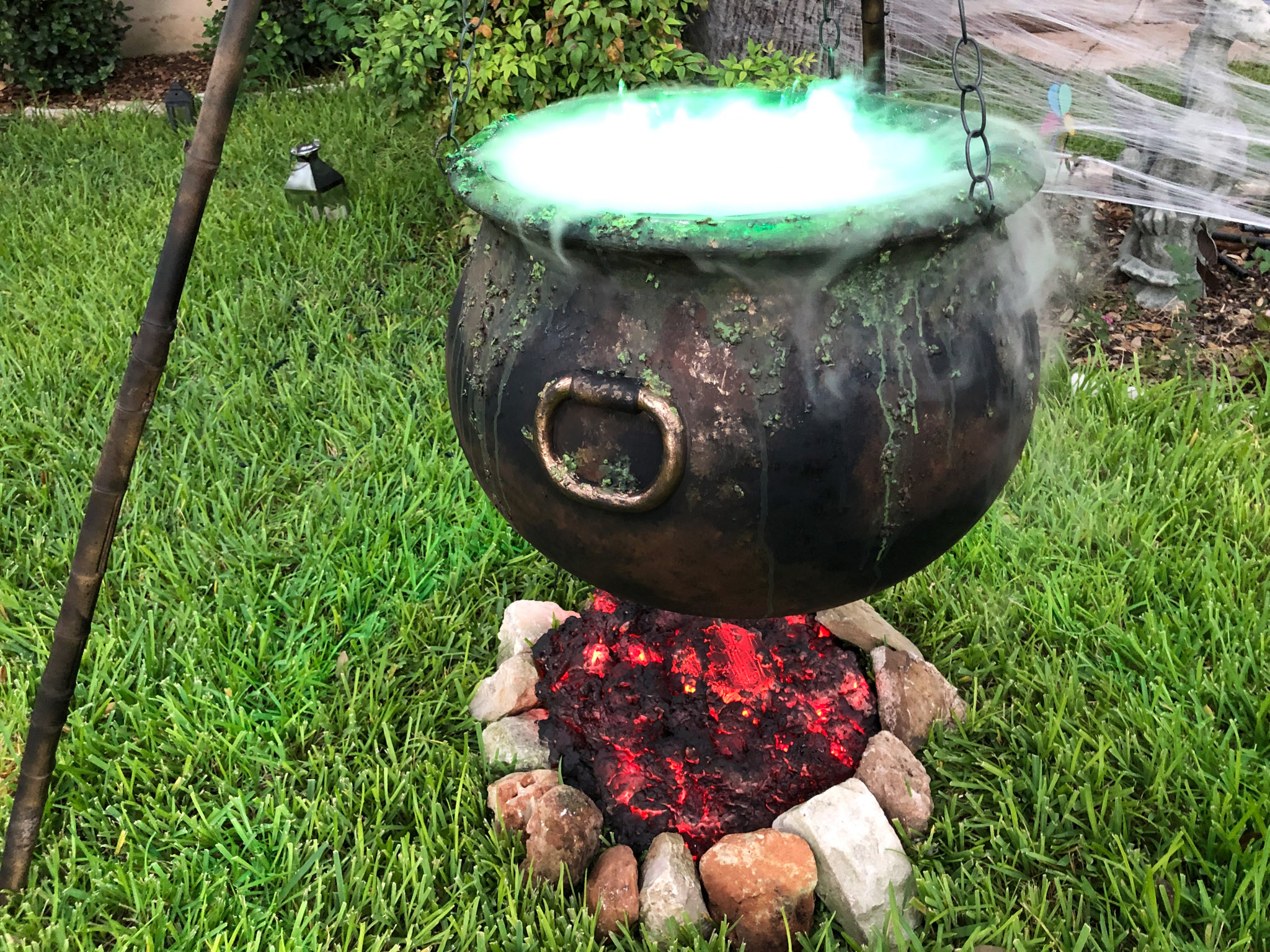 The Witch’s Cauldron is a classic Halloween prop and incredibly fun to make! Elevate a store-bought cauldron by painting on a rusty finish. Mix ModPodge with oatmeal and paint it green to create a chunky, overflowing witch’s brew. Burning embers are easily simulated by spraying expanding foam over orange string lights. Use small ultrasonic pond foggers to create bubbles and mist rising from inside. A tripod made from lightweight bamboo poles is perfect for hanging your cauldron above your glowing coals.