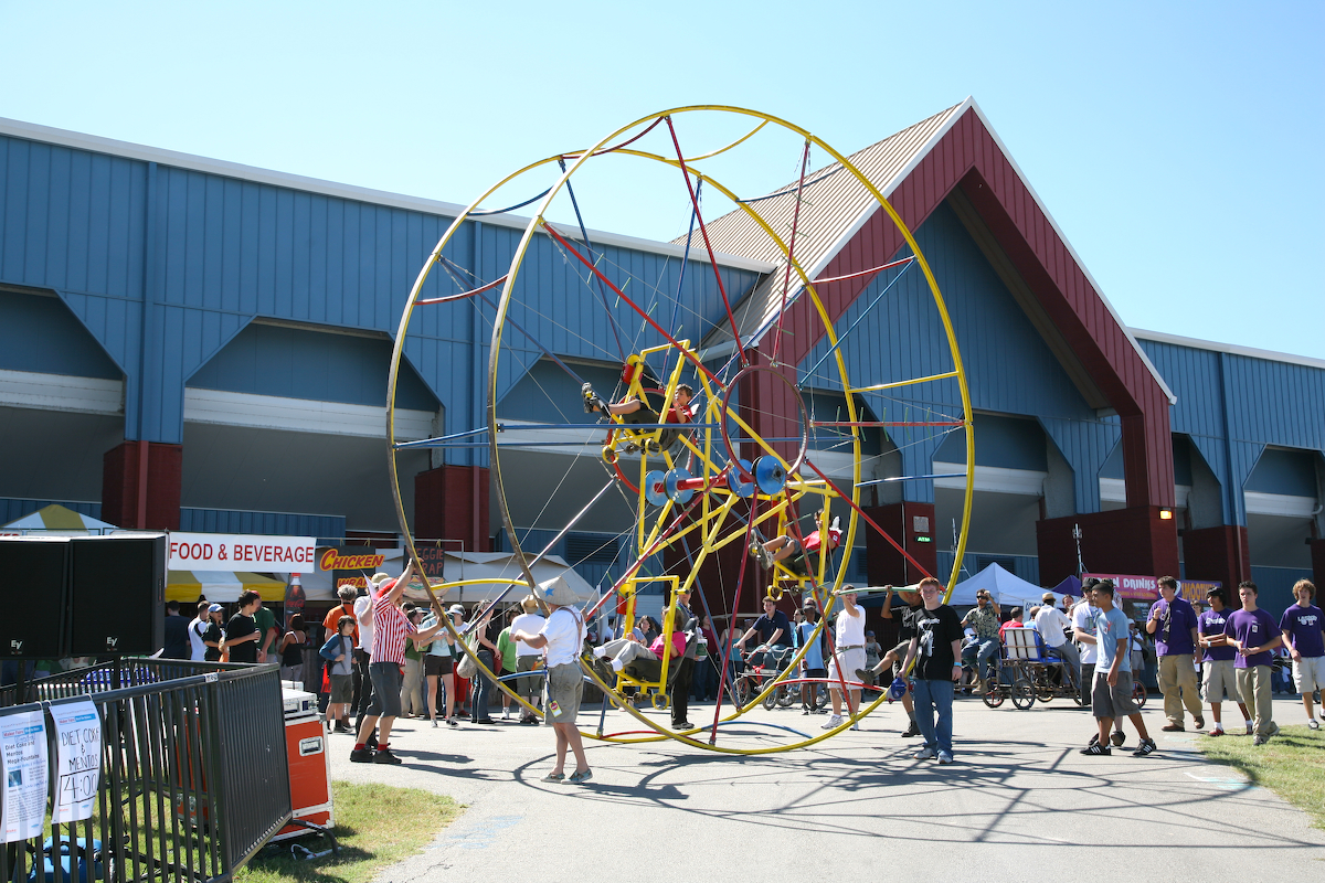 One of the things that really strikes me about Maker Faire is the impressive diversity of attendees (think: Burning Man bohemians and steampunk cosplayers meet Harry and Harrieta Homeowner). The Make: ethos really does appeal to an extremely broad range of people. The staggering diversity and creativity were also evident in the vehicles that freely circulated throughout the fairgrounds. After the end of the first day of the 2007 Faire, when the announcement came over the loud speakers that the faire was closing, my son Blake and I hobbled toward the benches along the main thoroughfare of the grounds and we just sat there — aching, exhausted, stunned into a vacant kind of tired silence. Nearly unable to move, we watched as a quiet parade of bizarre vehicles began to float past us on their way towards the exits. It was the most insane, and insanely great, fleet of conveyances I’ve ever encountered: all manner of odd craft, from electric bikes and cars, to pedaled recumbents, homemade Segways, a solar-powered motorcycle, and a guy riding a motorized unicycle while holding a regular unicycle in front of him as a second wheel. And then there was the chariot pulled by a Roman centurion robot, and a covered wagon pulled by two robotic horses. It was so surreal, so ethereal, it felt like a dream, if your dreams were designed by Salvador Dali and engineered by Rube Goldberg.