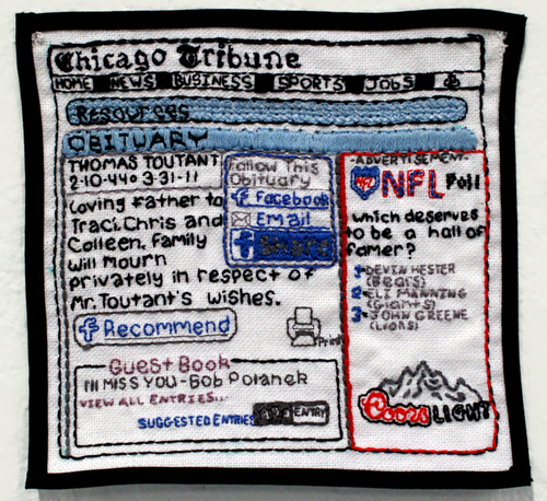 Artist Colleen Merrill created these traditional needlework versions of social media that look at how these forms of communication affect our lives.