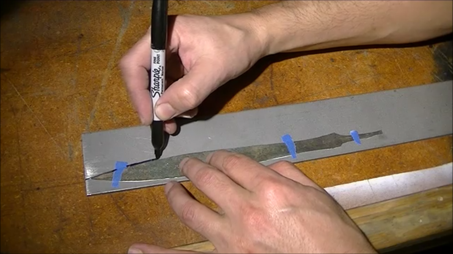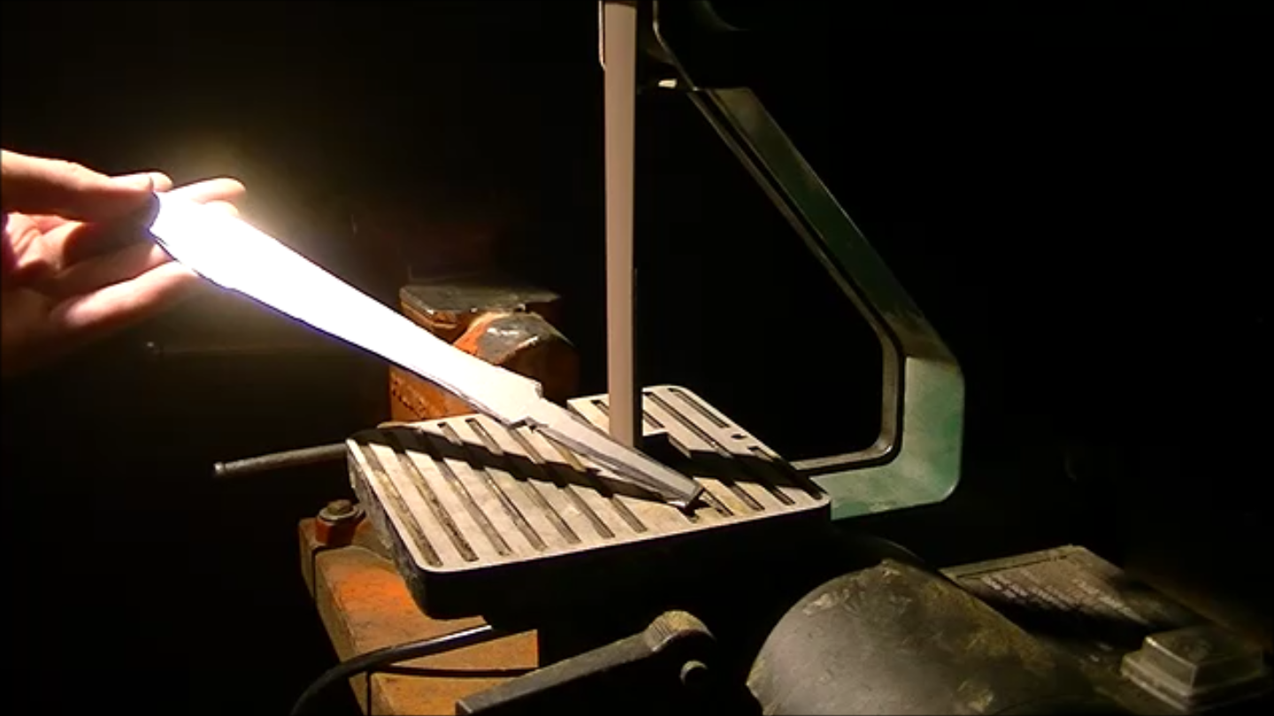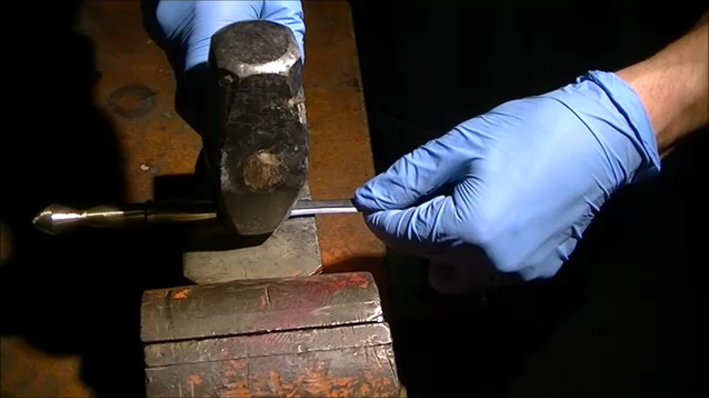 After obtaining the fire tools that he would use for the project, his first attempt was to reform the handle into something appropriate for a sword involved him heating it until it was red hot, then hitting it with a hammer. One might think this would work well, but Quiroz reports that it instead immediately crumbled. After trying this process again unsuccessfully, he decided to instead cut, grind, and file it into shape. He then deformed part of it with a hammer to hold the blade securely.
