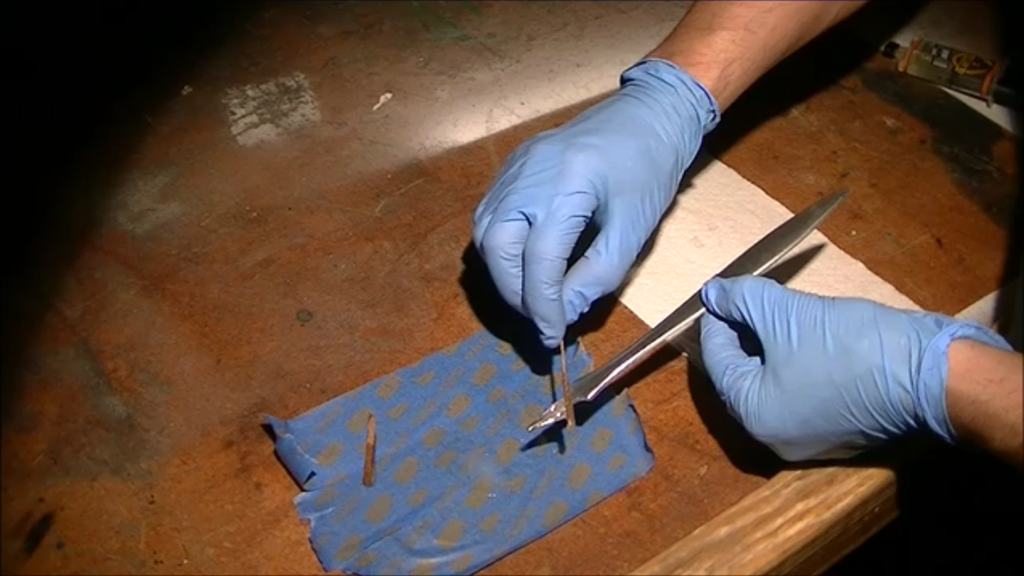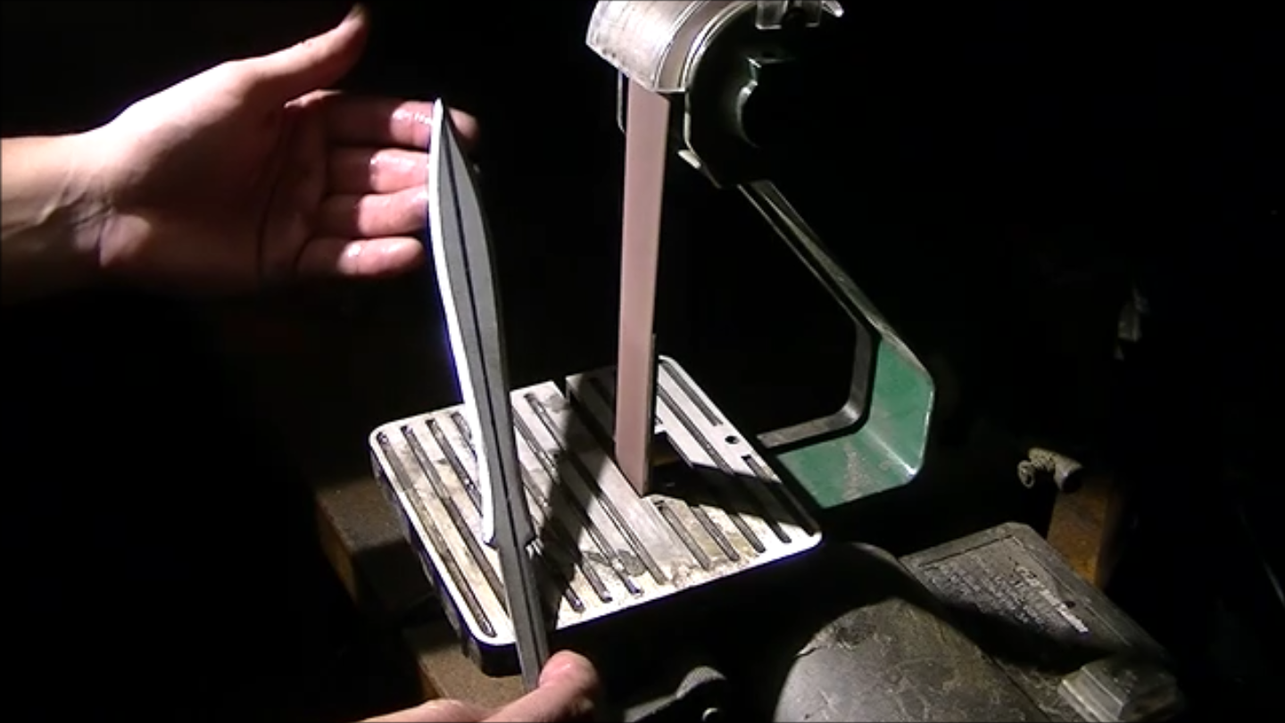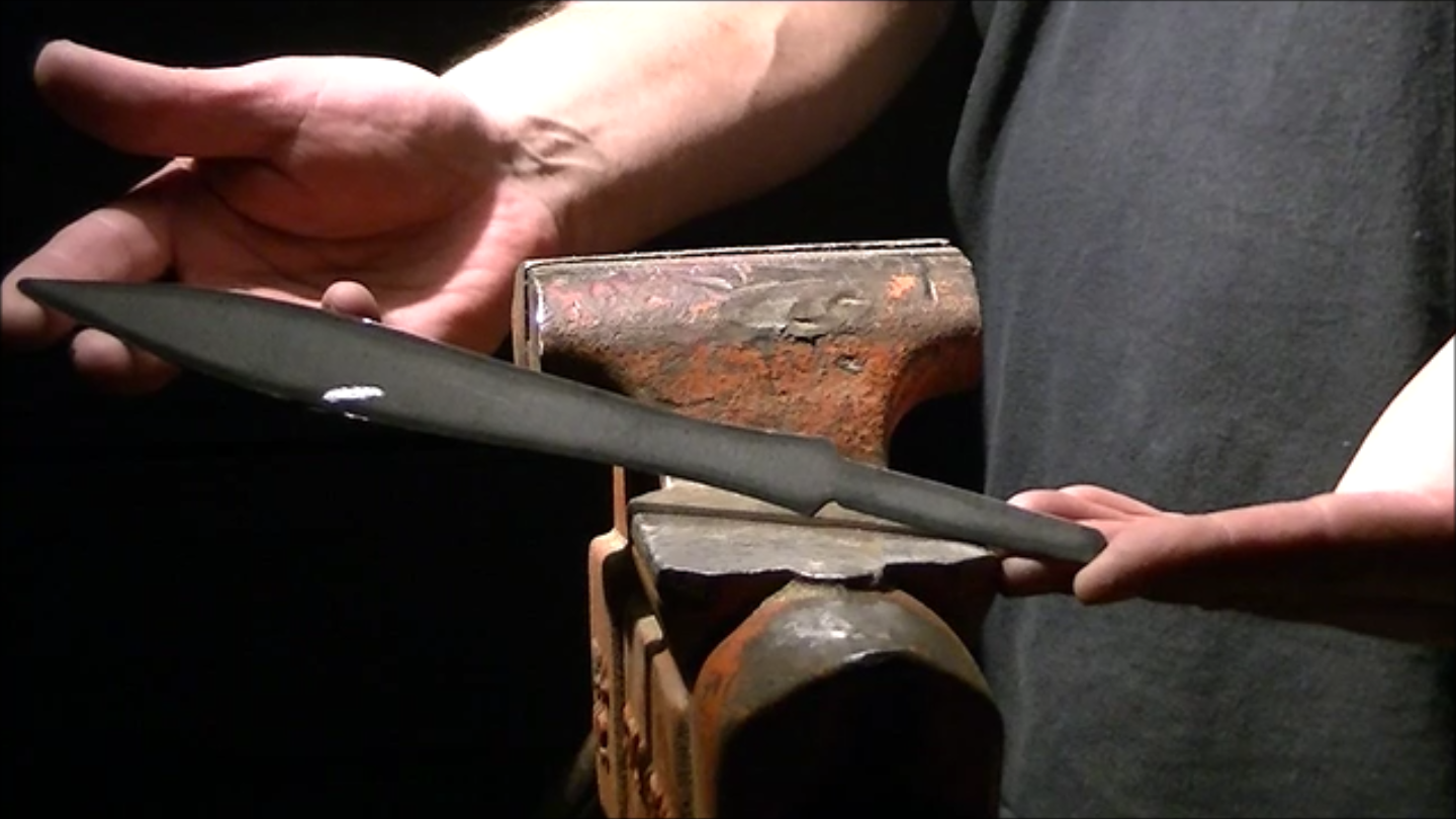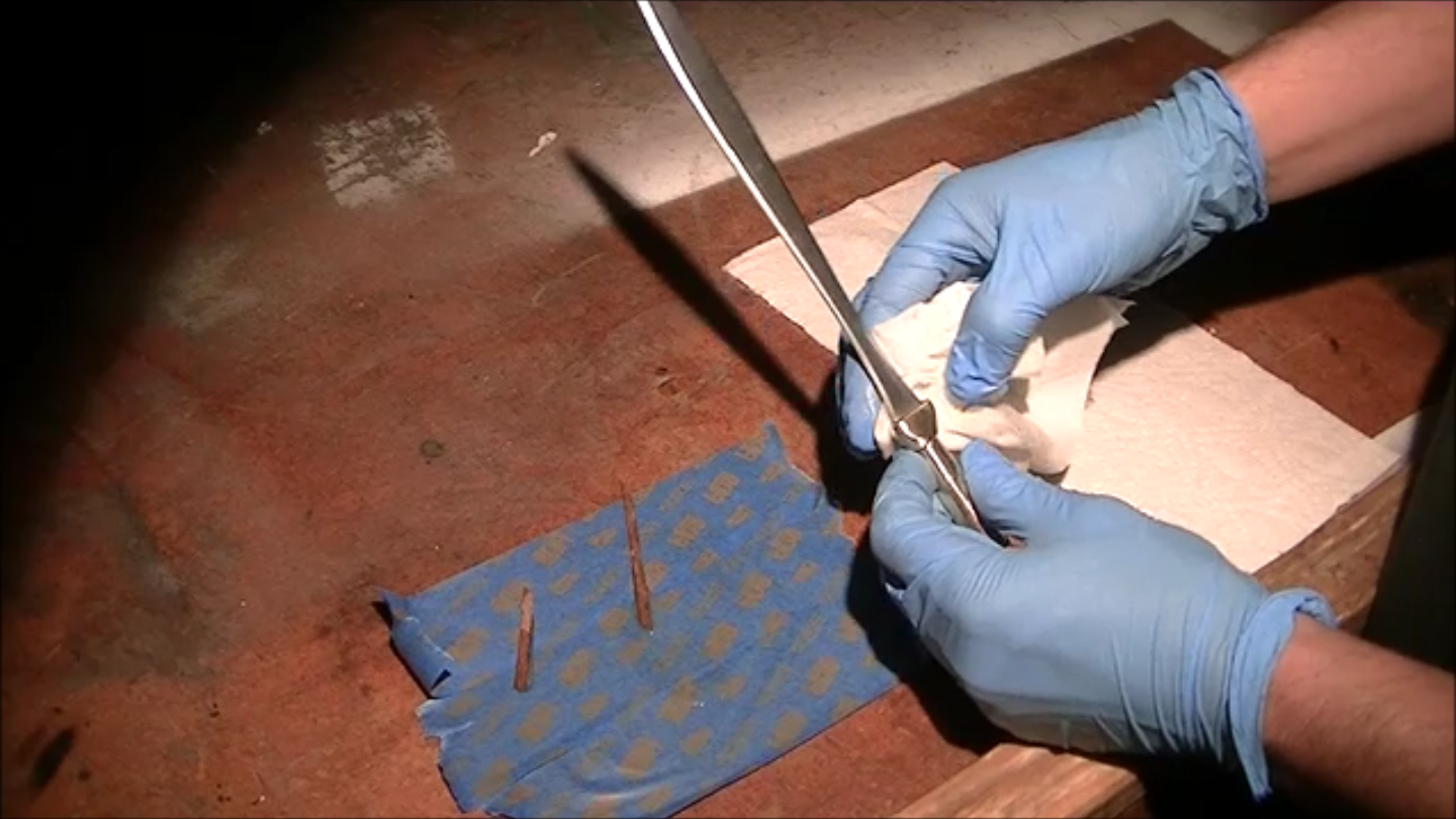 After obtaining the fire tools that he would use for the project, his first attempt was to reform the handle into something appropriate for a sword involved him heating it until it was red hot, then hitting it with a hammer. One might think this would work well, but Quiroz reports that it instead immediately crumbled. After trying this process again unsuccessfully, he decided to instead cut, grind, and file it into shape. He then deformed part of it with a hammer to hold the blade securely.