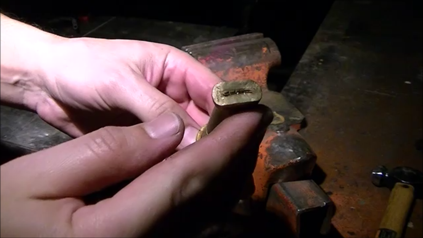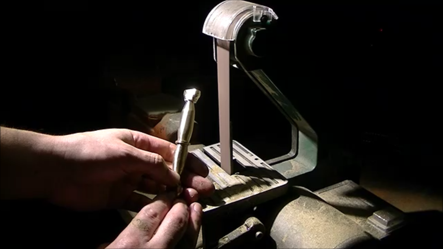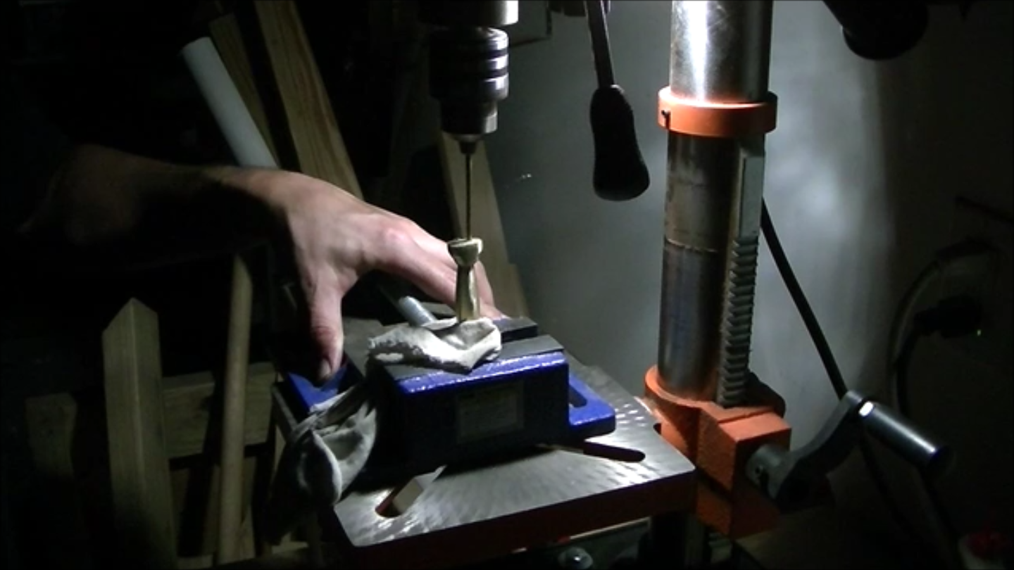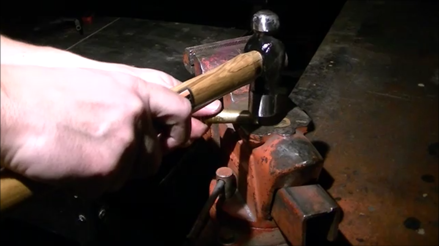 To attach everything, the handle, now deformed to the point where the tang would not slide into it, was drilled on a drill press, then further opened up with a file. He then applied epoxy to both the tang and handle and attached the two together, hitting the assembly with a hammer for good measure. Though not shown in the video, he did polish the handle after hammer blows, but Quiroz felt this wasn’t very interesting for his audience, as there is already quite a bit of sanding and filing in the video.