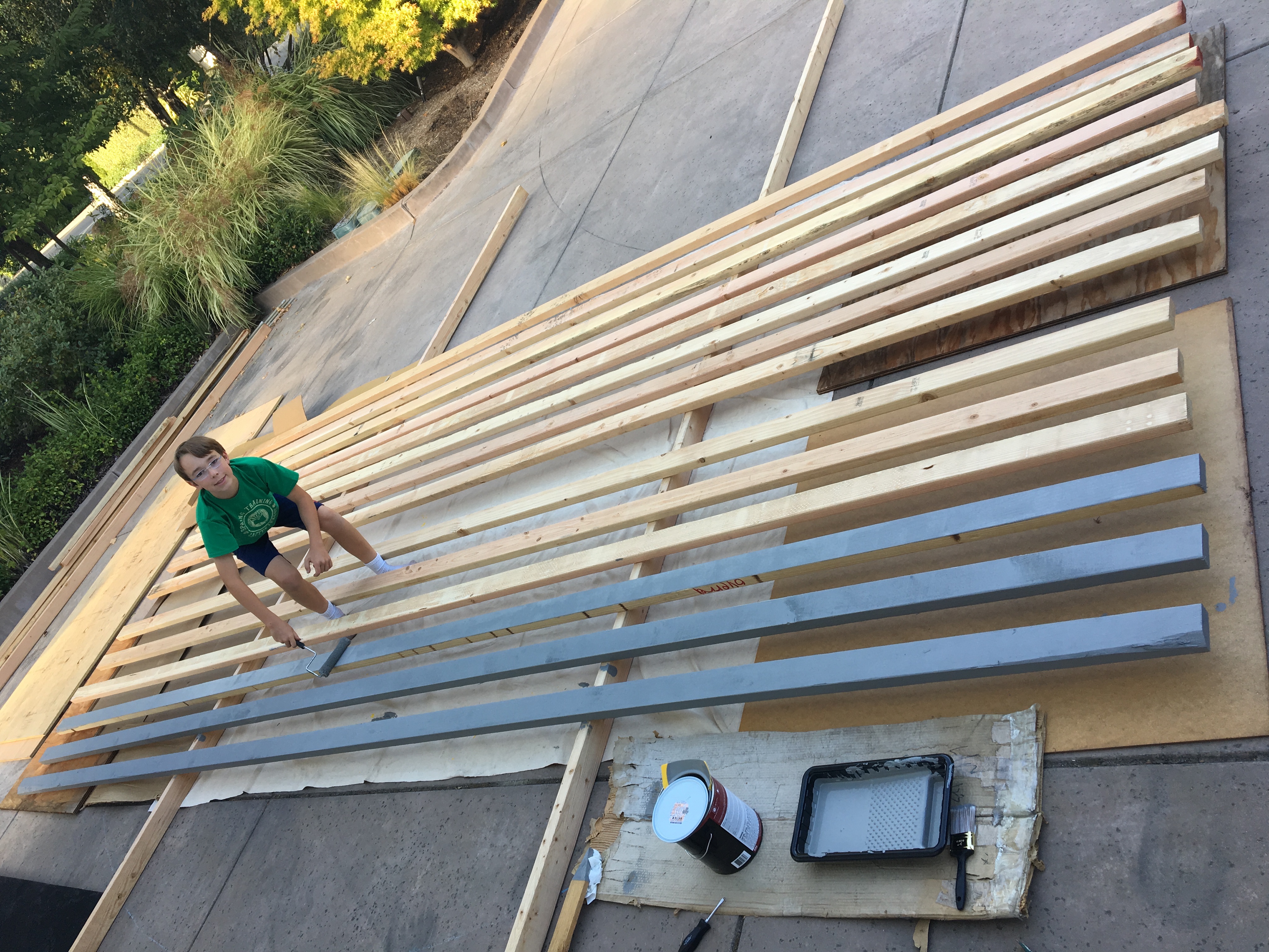 The build took just over a month, beginning September 24th and finishing on Oct 29th — just in time for the family’s annual Halloween party. Its main structure is made from 2×4’s, painted grey by the kids. “What was great about it was they set up the wood on saw horses, they figured out how to do the tops and bottoms and sides,” Powell says.