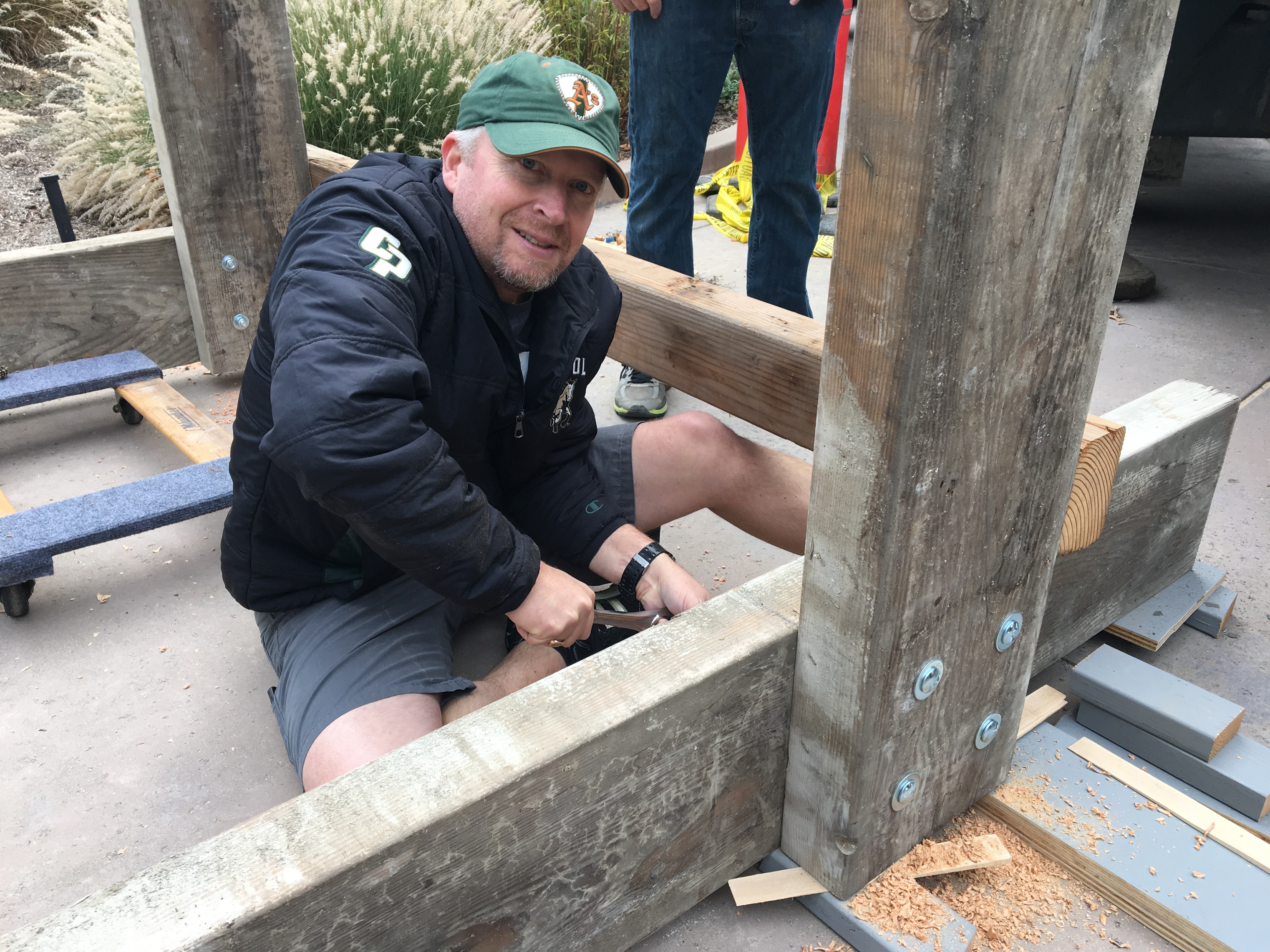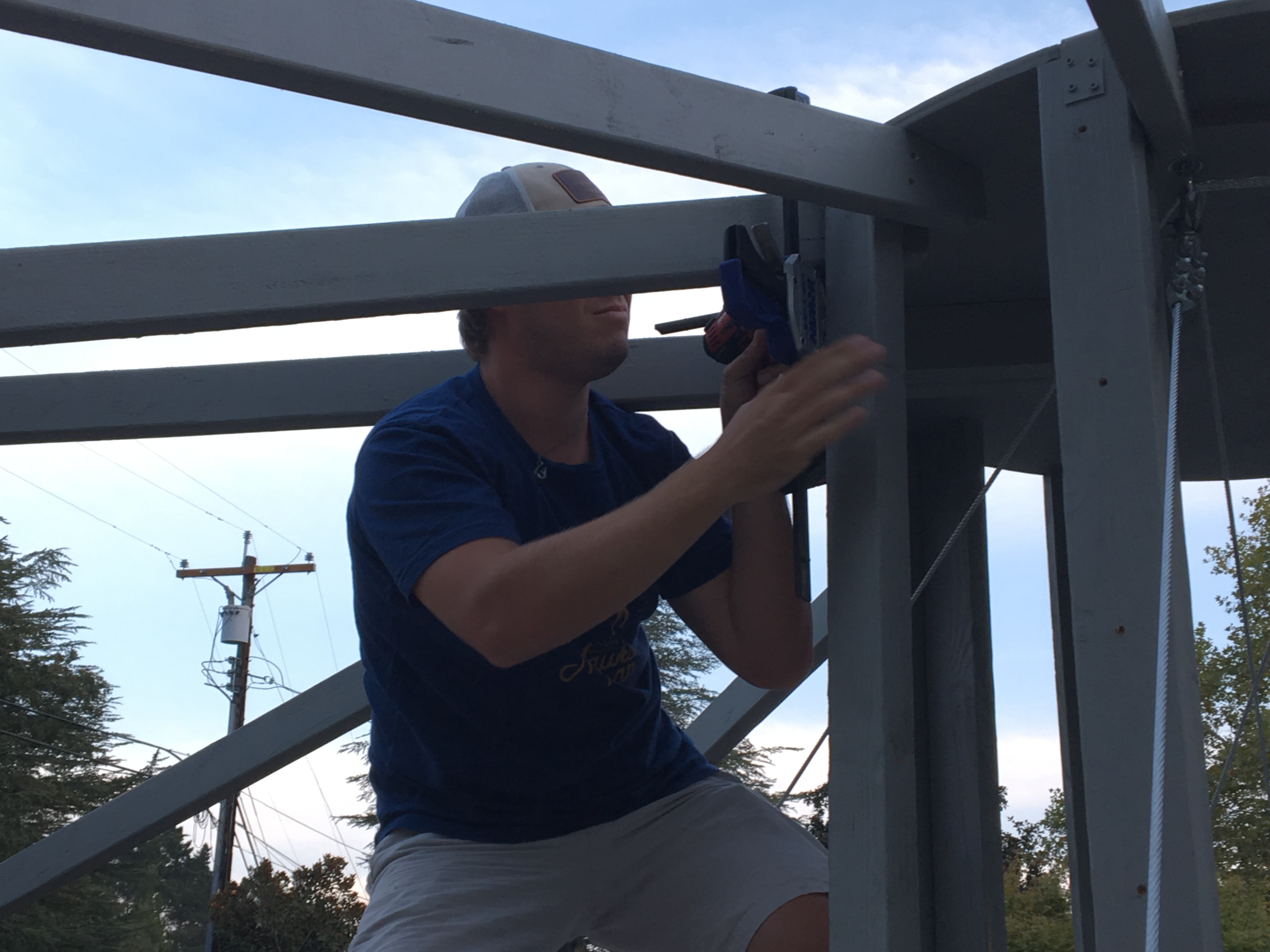 From there, they laid out the initial structure, getting the 2×4 spokes evenly aligned and creating the “mandibles,” as Powell calls them. From there they built the center tower, which the framework that would create the body of the ship would connect to.