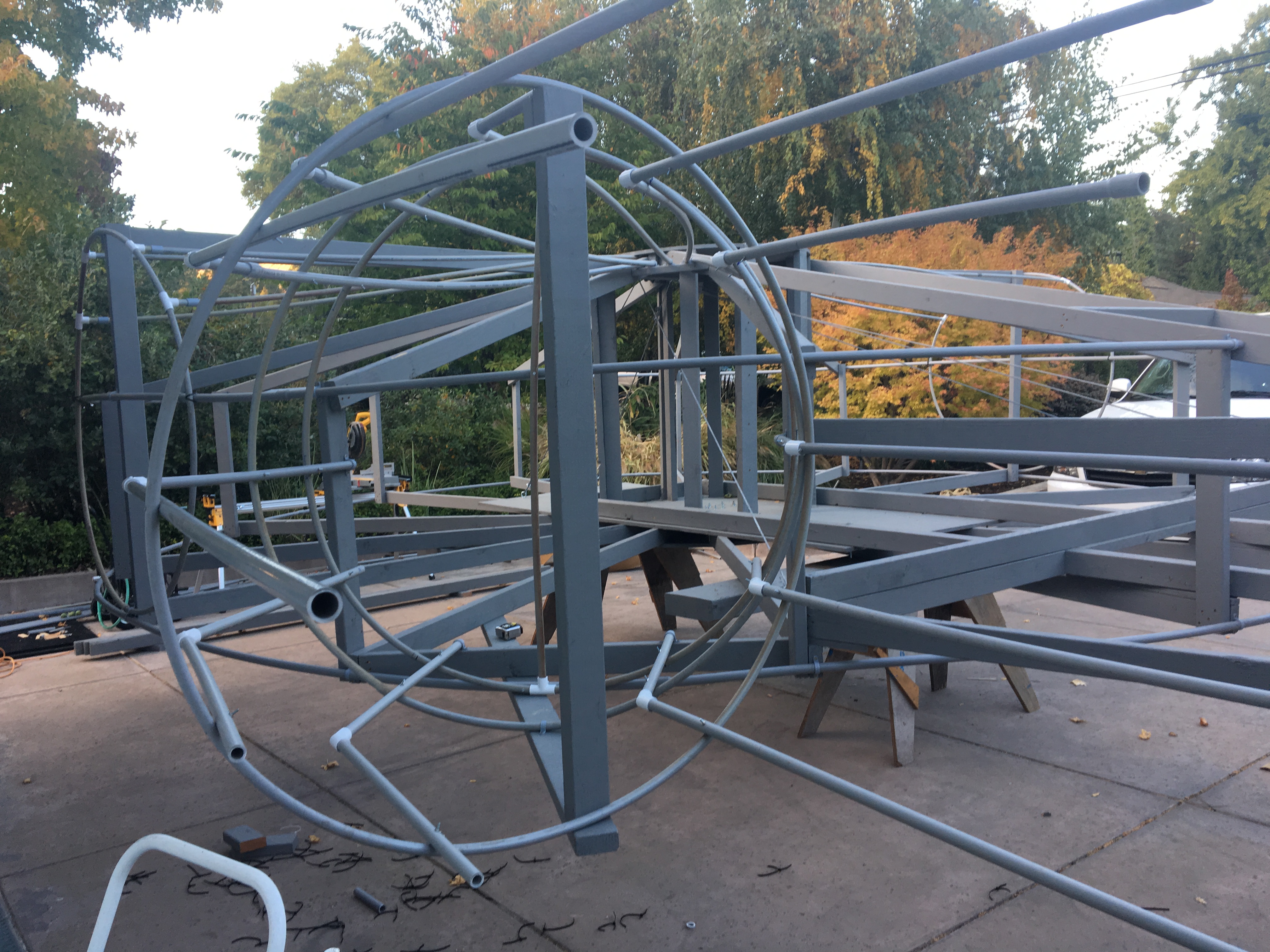 The structure required more strength than originally anticipated, which meant that they needed to change it from pipework for the body to more 2x4s, increasing its weight from 400 pounds to 700.