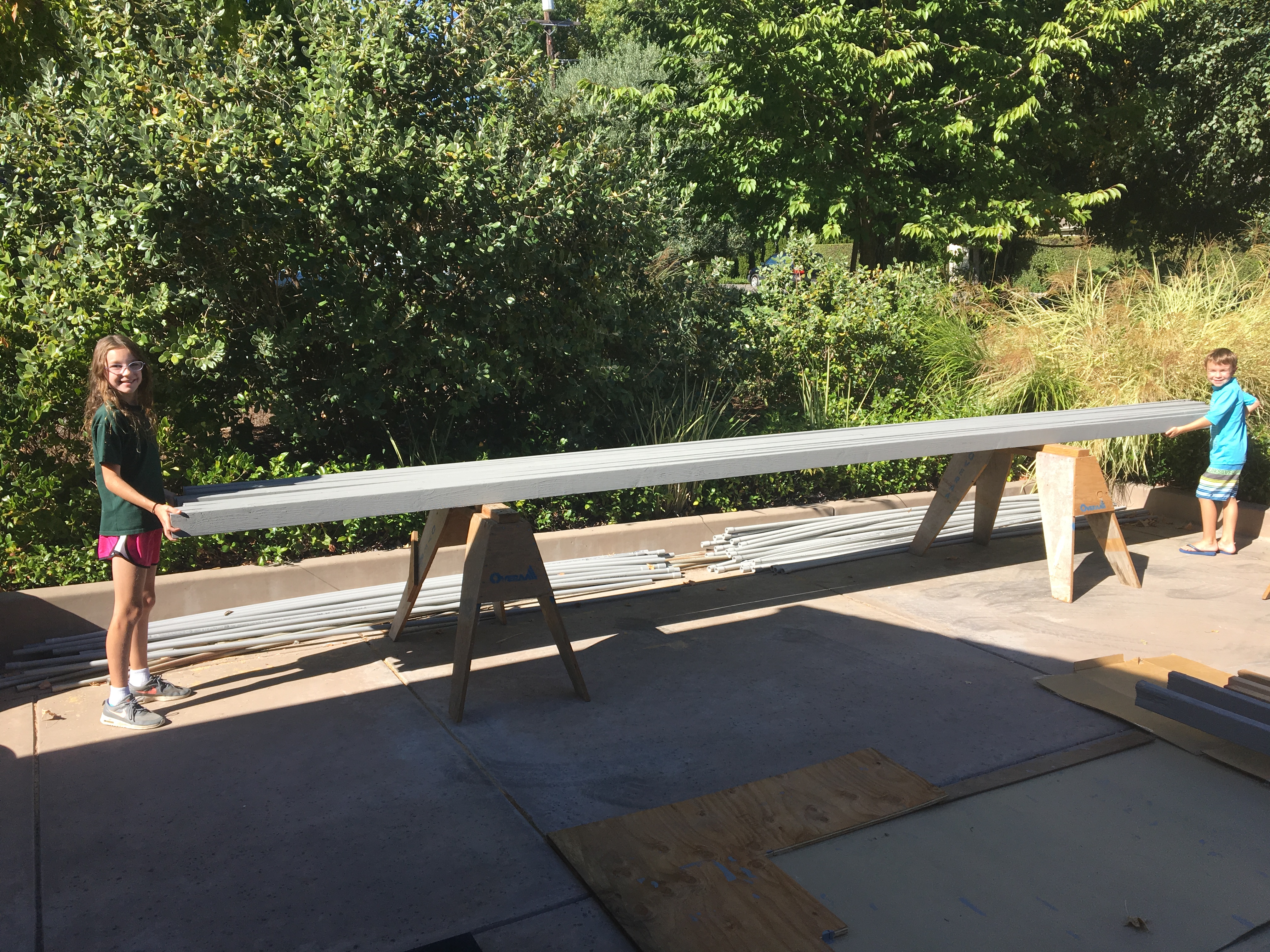The build took just over a month, beginning September 24th and finishing on Oct 29th — just in time for the family’s annual Halloween party. Its main structure is made from 2×4’s, painted grey by the kids. “What was great about it was they set up the wood on saw horses, they figured out how to do the tops and bottoms and sides,” Powell says.