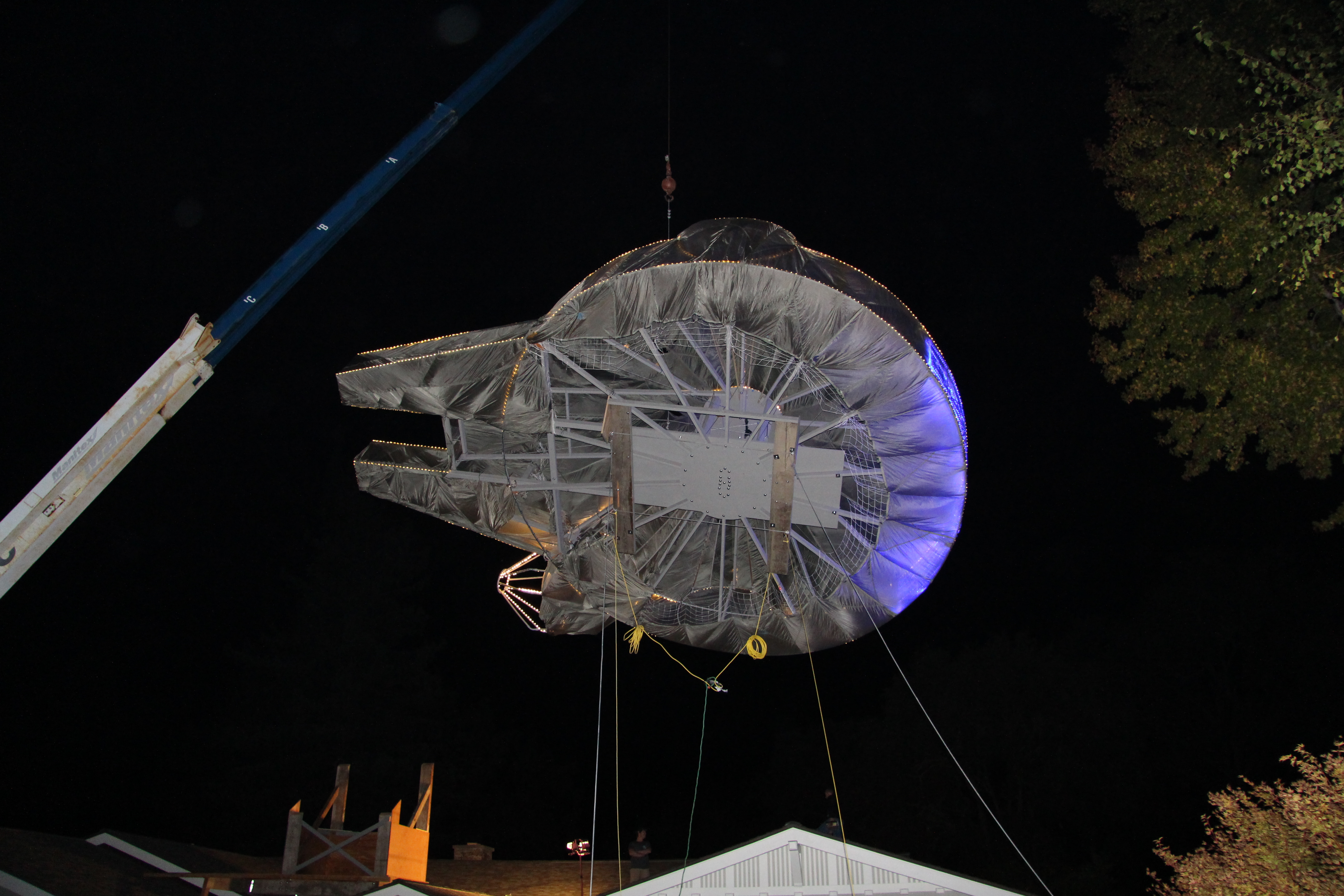 The skin of the Falcon is made from a military-surplus parachute, the same one that Powell used on the Death Star, and uses LED rope lights to accent its shape and create the blue lights of the rear thrusters.