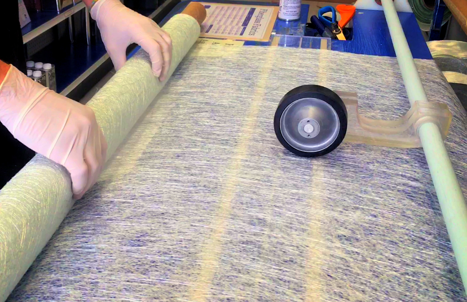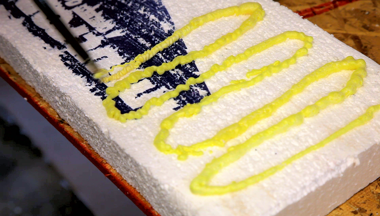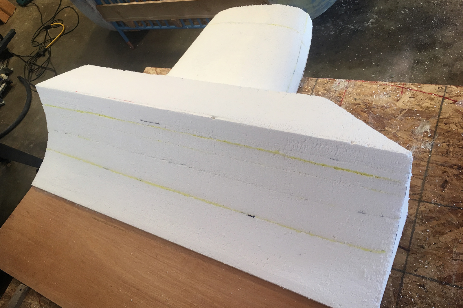 Once things were shaped, he applied blue painter’s tape to the build to further smooth the surface. The other purpose of this tape was to give him a better indication of where the fiberglass would be laid, since it changed the background from white foam to the tape’s blue color. As this was Adams’ first time working with fiberglass, his friend Steve Burnaroos, who has quite a bit of experience working with this material, showed him the basics of this art.