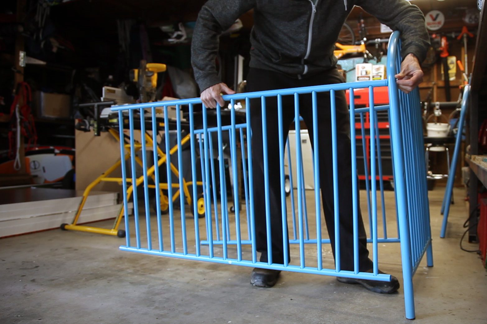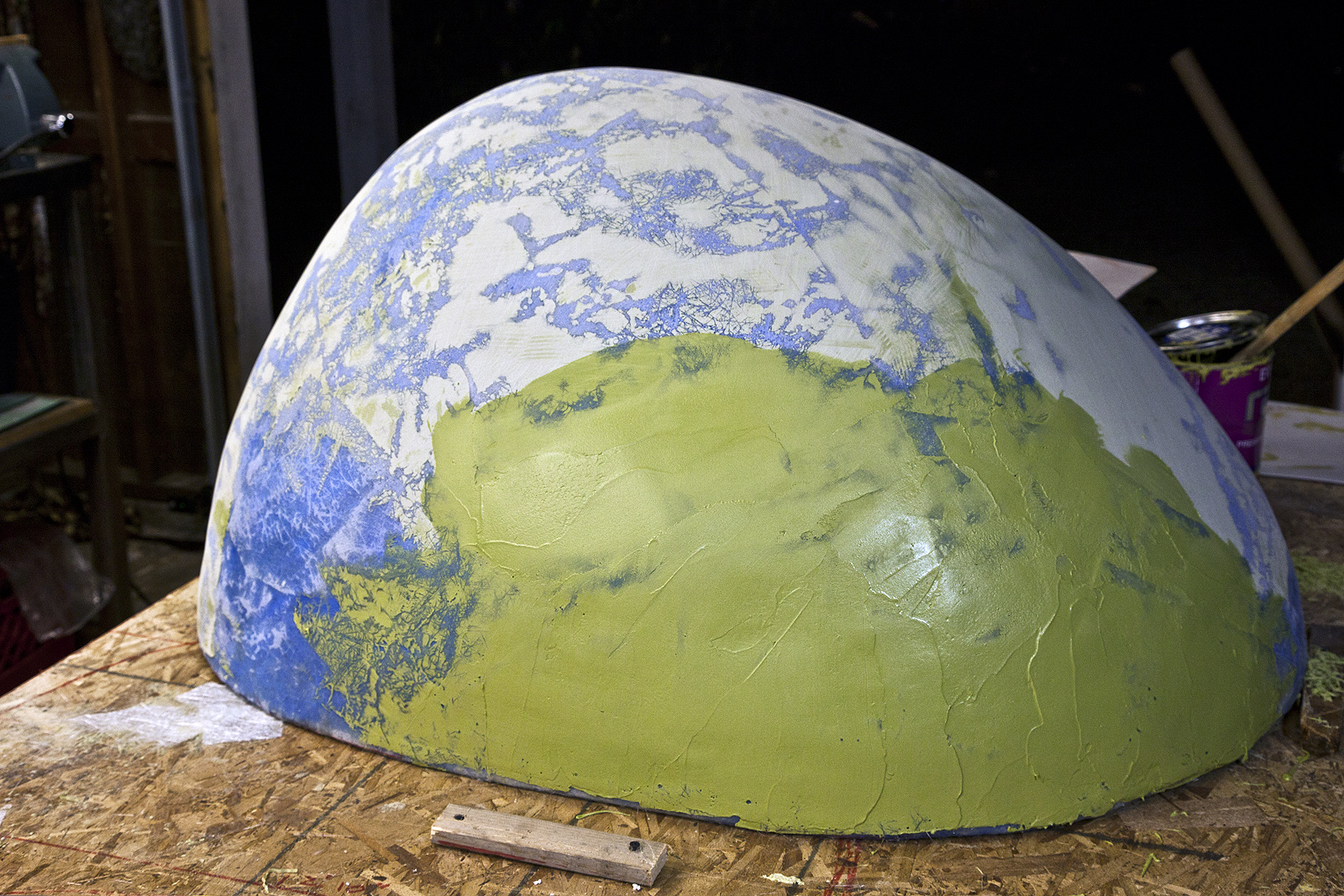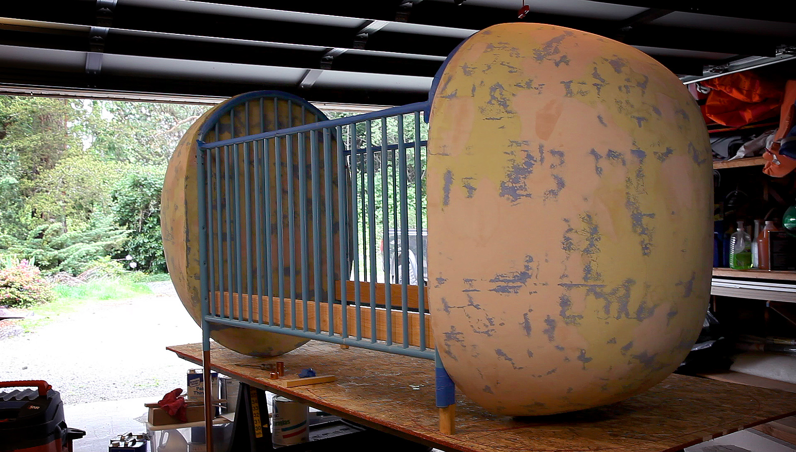 Once it was time to take his ideas from the virtual world to real life, he purchased a blue steel crib to act as the sub’s base, as well as several foam panels and fiberglass to make it into an actual “baby U-boat.” To form the cone shape on the bow and stern, he glued circular layers of foam together with a foam sealant in progressively smaller diameters. He then cut the jagged edges down with a saw in order to smooth out the shape.