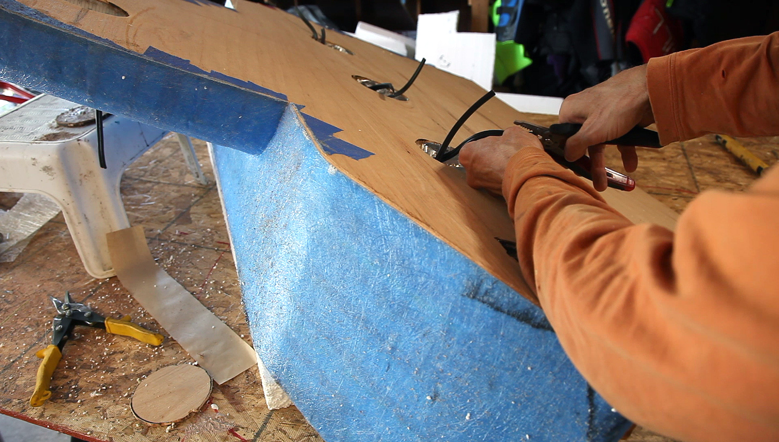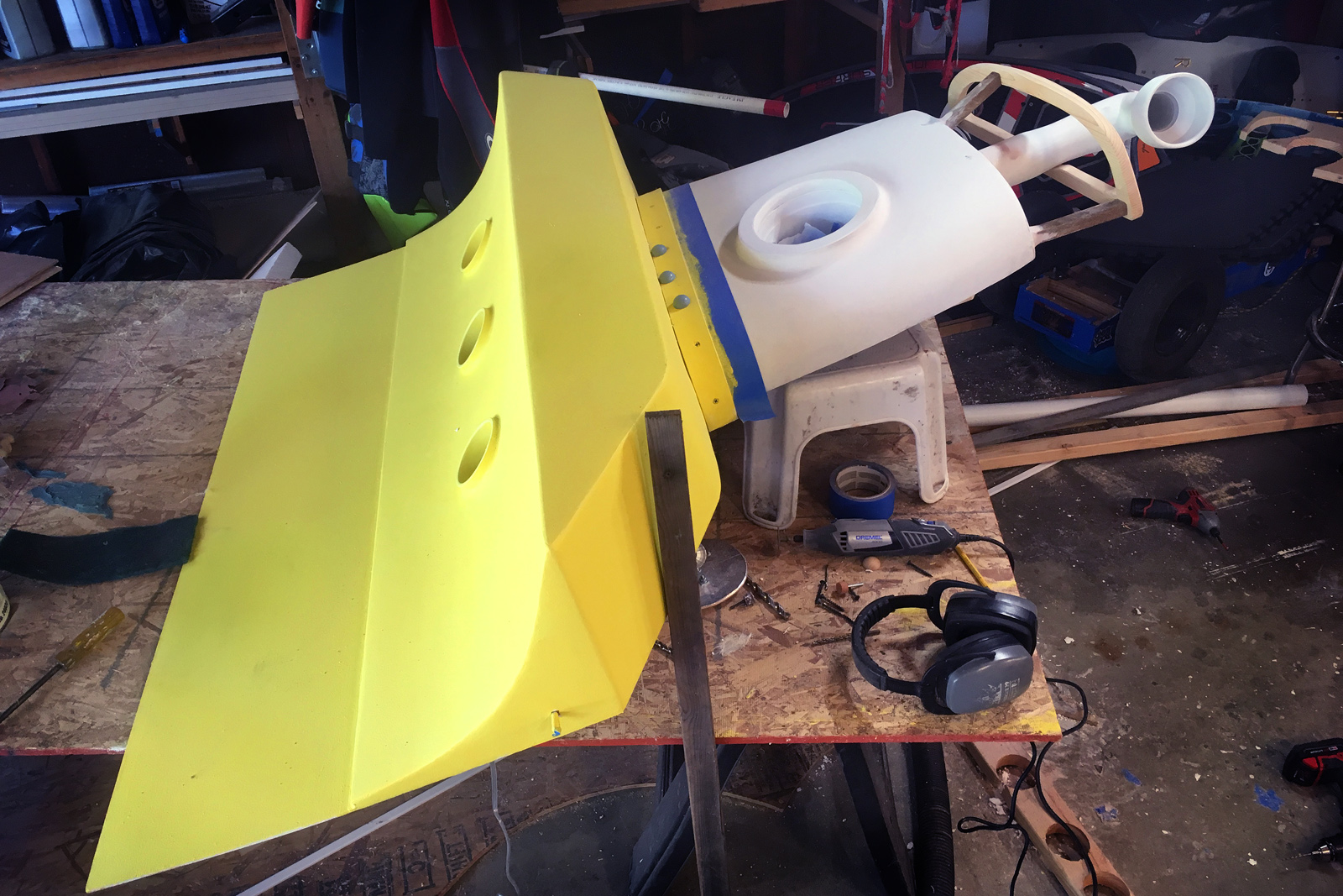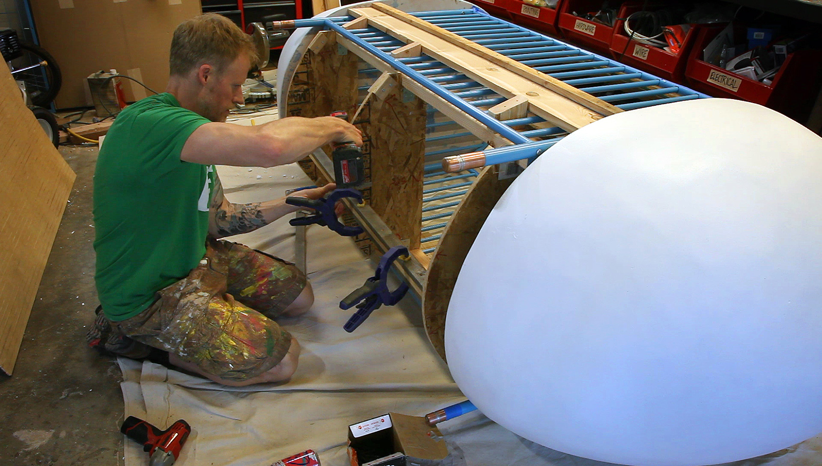 Fiberglass was then laid on the bow and stern, taking care to eliminate any air bubbles as it cured. Once dry, the assembly was sanded, and body filler was then added to smooth out the structure. After more sanding, scraping, and additional coats of filler, the bow and aft structures were finally smooth. These were attached to the crib, along with copper pipe leg extensions, at which point the build seemed to be taking shape.
