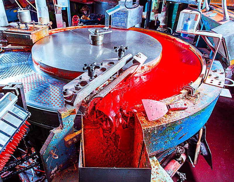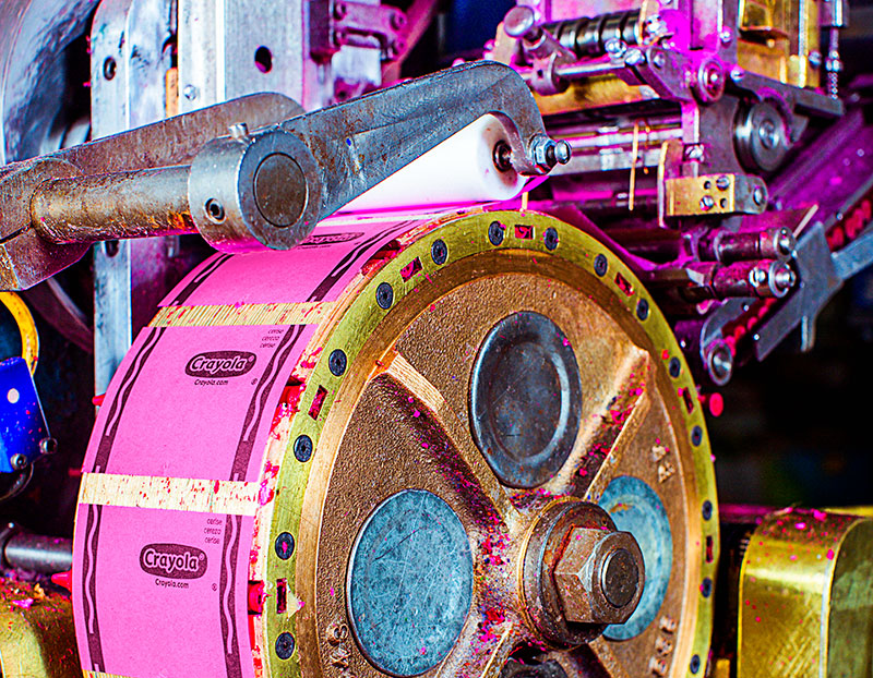 The process starts with railcars full of paraffin wax. Crayola processes their crayons like they would food, which is good, because crayons are a likely part of most children’s diet. Twice a week the railcars of wax are heated with steam by an oil-filled boiler, while workers pump the molten wax into a silo. Each silo holds up to 100,000 pounds of wax, and the factory uses a silo a day. The silos have pipes attached where the wax travels to the mixing area where workers adding strengthening agents and the powdered pigment. The liquid wax then moves into the cooling station — a steel rotary mold with a flat top — and an ejection station and robotic arm attached which carries them over to the labeling station. Although there are 120 different shades of Crayola, there are only 18 labels made, which cover the whole color spectrum. The sticks are fed into a funnel and put on a platform where a mechanical arm sweeps them into a box where a laser etches a date code on the box, and a metal detector makes sure there is nothing but crayon inside. After that, they are boxed up and put on pallets to ship out worldwide.