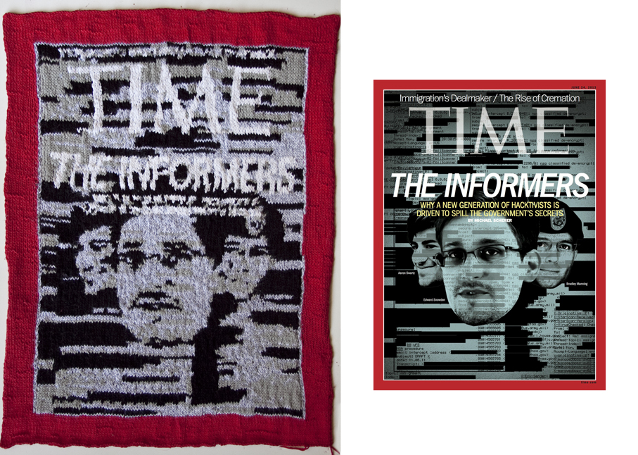 Tumblr user Material Witness has decided to try and make sense of the effect that the 24 hour news cycle has on our lives by knitting pieces of news media, starting with this poignant Time Magazine cover.