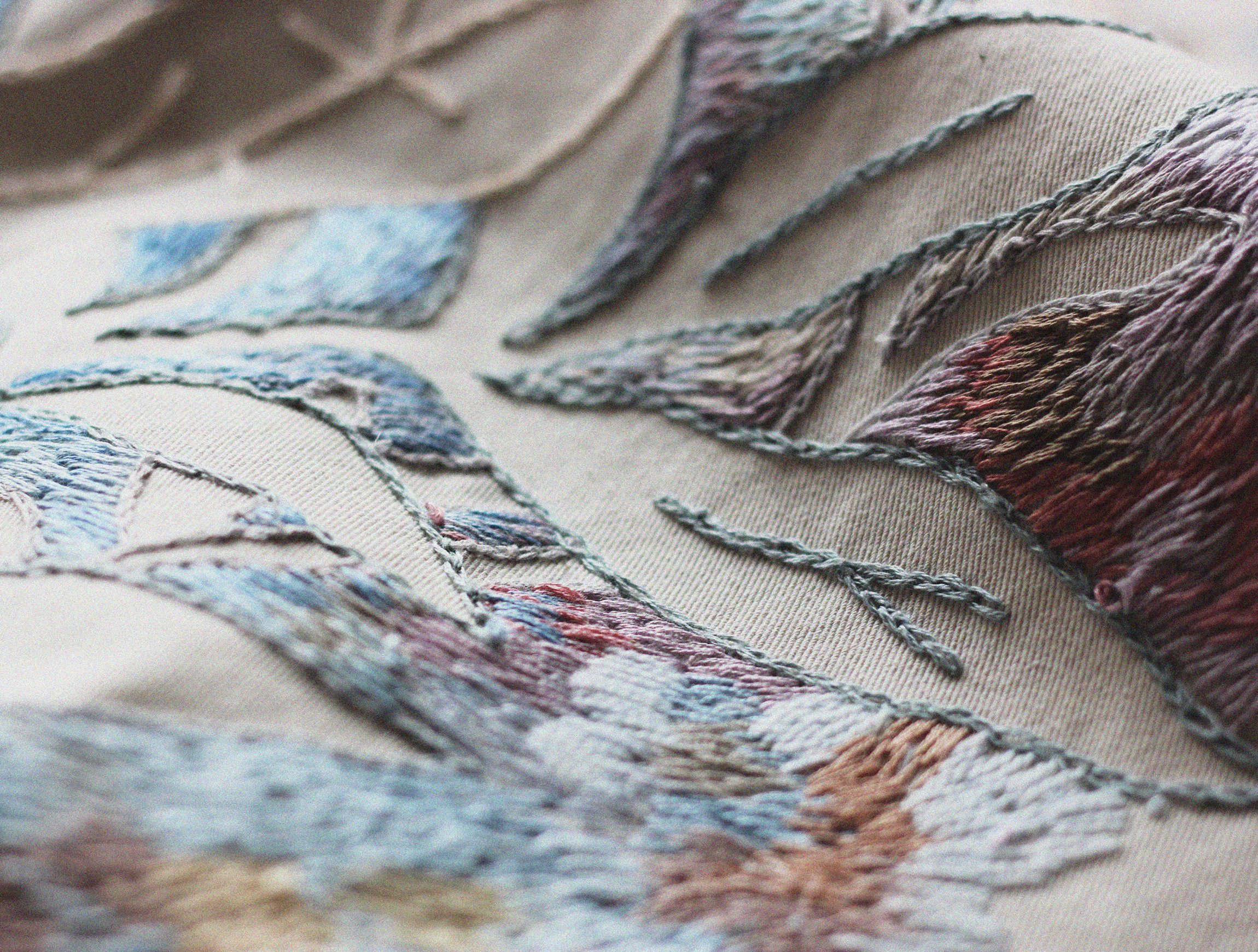 Smirnova sketches some ideas on paper and chooses a favorite to scale appropriately as a template for embroidery. She transfers the image to fabric using a pencil, and sews the outline before filling it in. As with watercolor, Smirnova chooses a color palette and adds hues from dark to light.