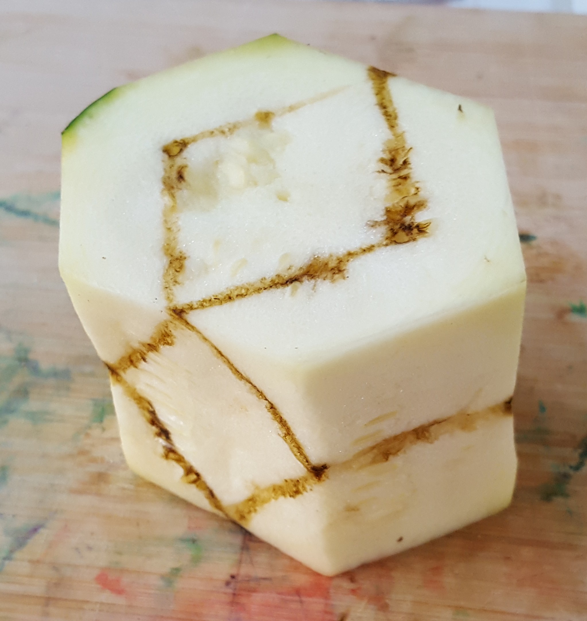 For the final polyhedral sculpture in the series, we are going to turn this almost perfectly spherical zucchini into a rhombic dodecahedron, which is not an Archimedean solid, but instead the dual of one, a so-called Catalan solid.