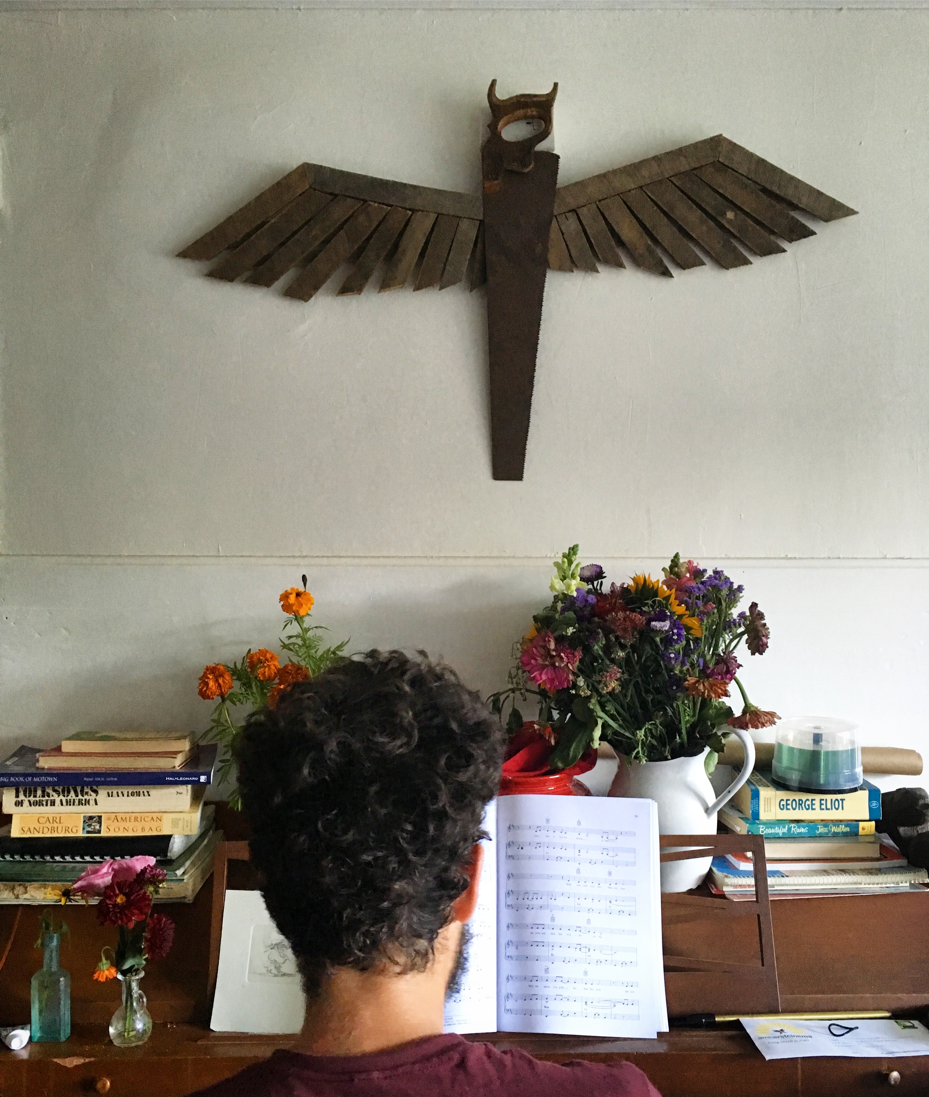 I like to be playful and curious. I still make maple syrup in the late winter, boiling it in the driveway over that retrofitted steel drum, and press apples in the fall with that grinder I scrapped together from old bike parts and barn wood. When there’s time, I assemble large winged sculptures that use old plaster lathe that I’ve saved from construction sites. Also, once a year, I teach a junk instrument building workshop to 2nd graders.