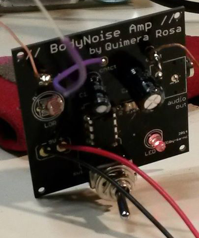 The BodyNoiseAmp translates touch into sound. It’s essentially a simple circuit running through a performer’s body and amplifies sound manipulated through the touch of another performer. Quimera based its design on the LM386 chip and has explained its development at more than 20 workshops in Spain, Germany, France, Canada, Switzerland, and Belgium.