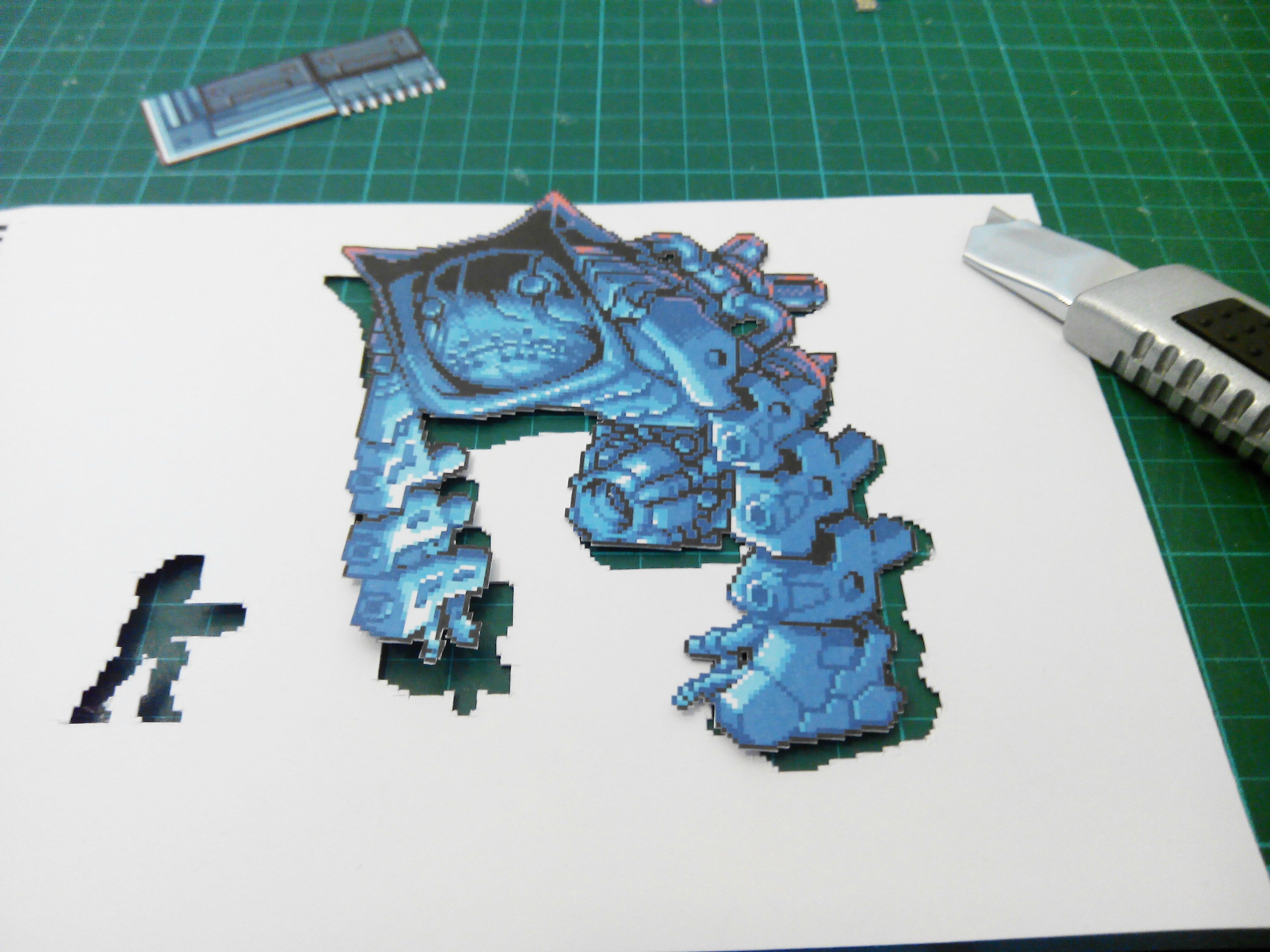 Tools and materials for this type of project are quite simple and include: thick paper, foamboard, plexiglass, glue, and a craft knife. To recreate this affect with your own choice of pixel art, start out by obtaining a good picture of the game, avoiding any compression methods that would enlarge the pixels. An isolated image of the background then needs to be completed using Photoshop, GIMP, or the image-editing program of your choice. Laurent used several different image sources to get the background correct, but according to the original Reddit post, some emulators allow for certain layers to be turned off. This could help enhance the image or just make this step easier.