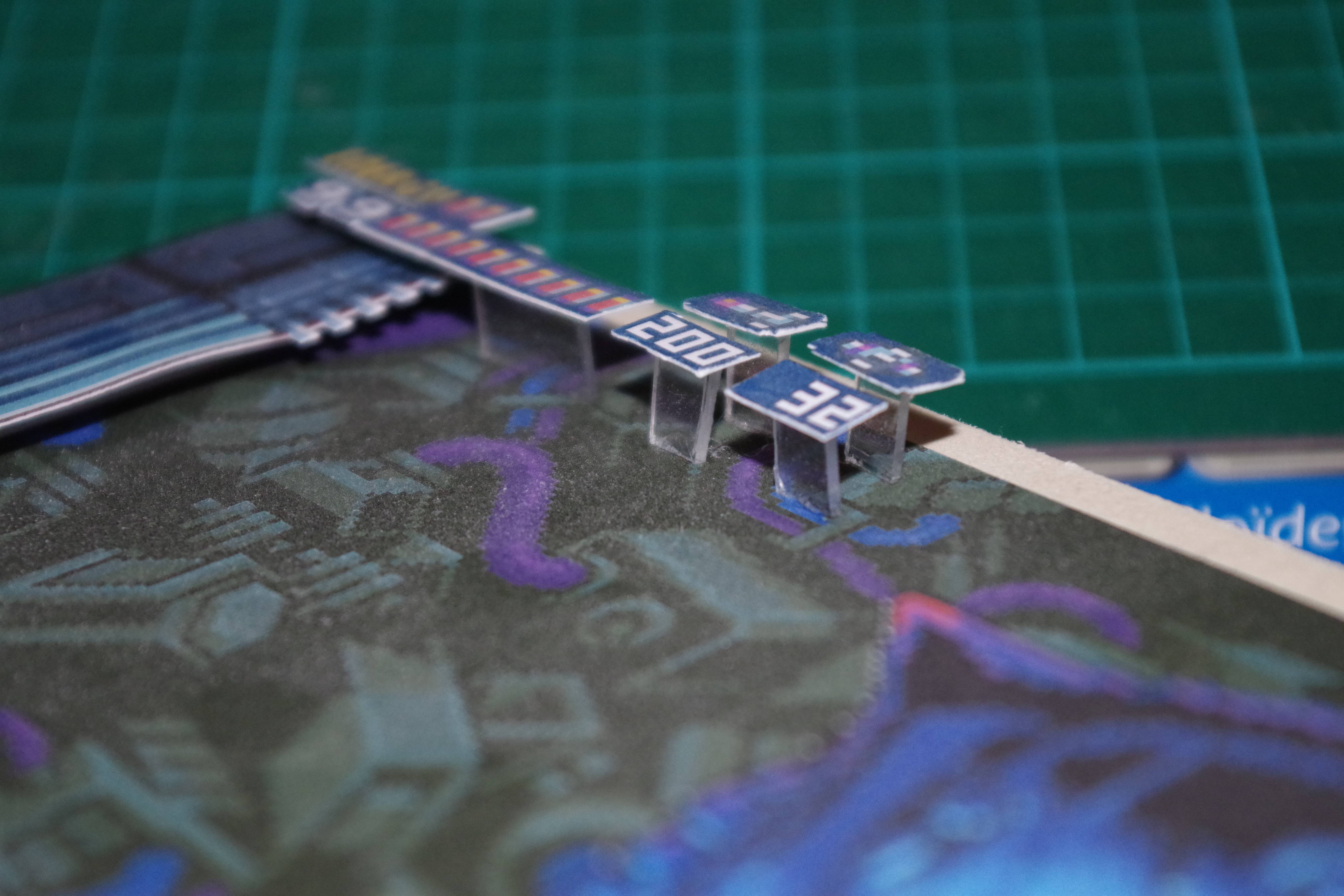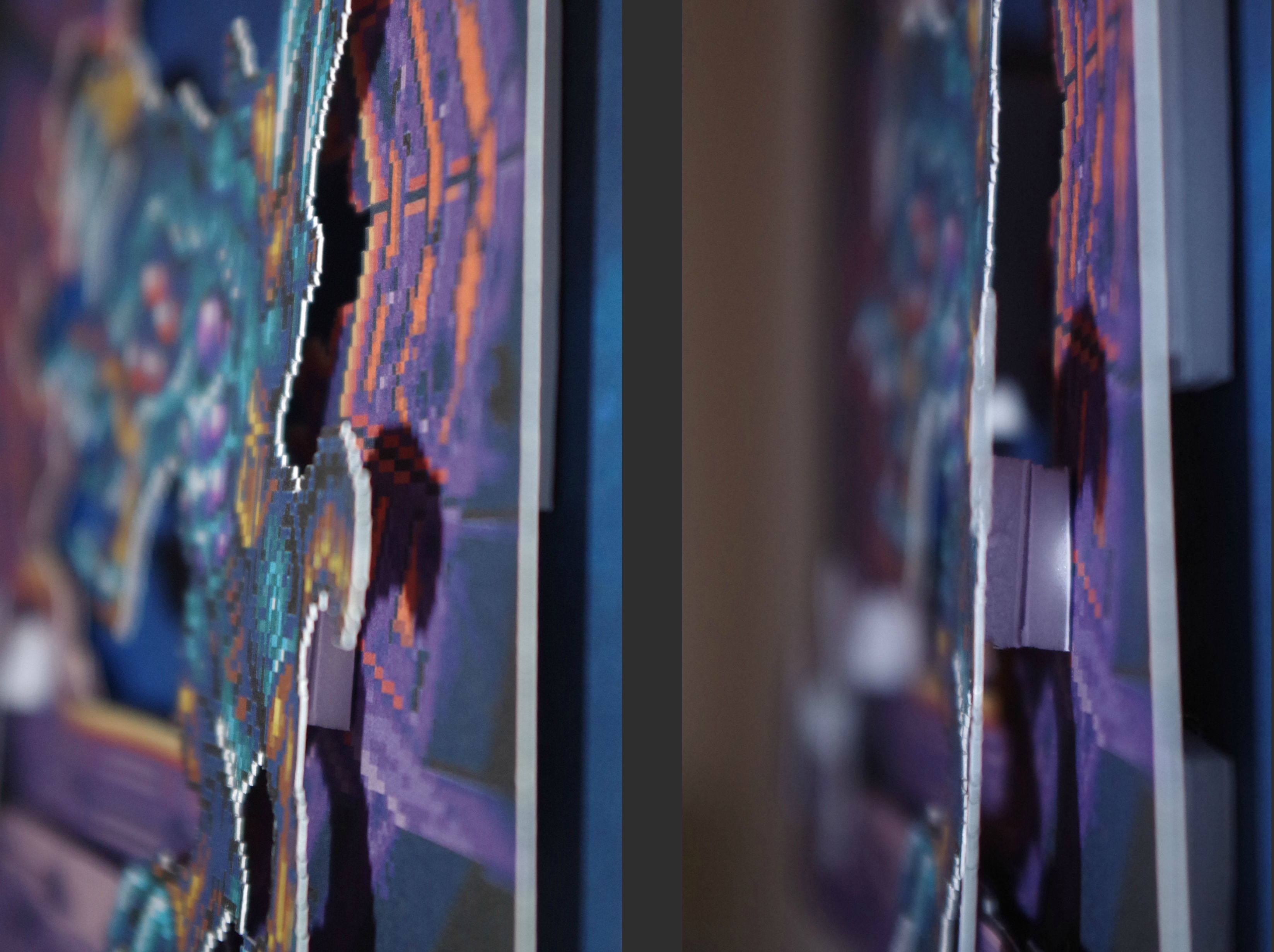 Images are then printed out on thick paper and slowly cut out pixel by pixel. Once everything is cut out, the figures are then glued onto the background on small pieces of foamboard to keep things separate and “three-dimensional.” Laurent also used plexiglass to separate the smaller displays (like ammo and time) so that the separation would be less visible.