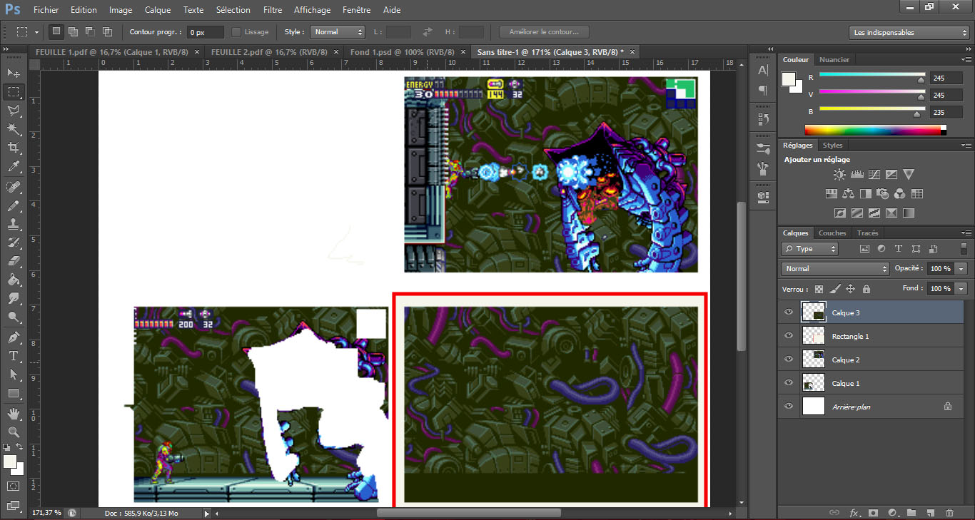 Although the instructions on his page are meant to apply to any game pixel art (or, I suppose, any image), Laurent provides scenery from his Metroid display in PDF form in his excellent tutorial. He also notes that he was inspired by Mav Vasquez’s art, as seen here.