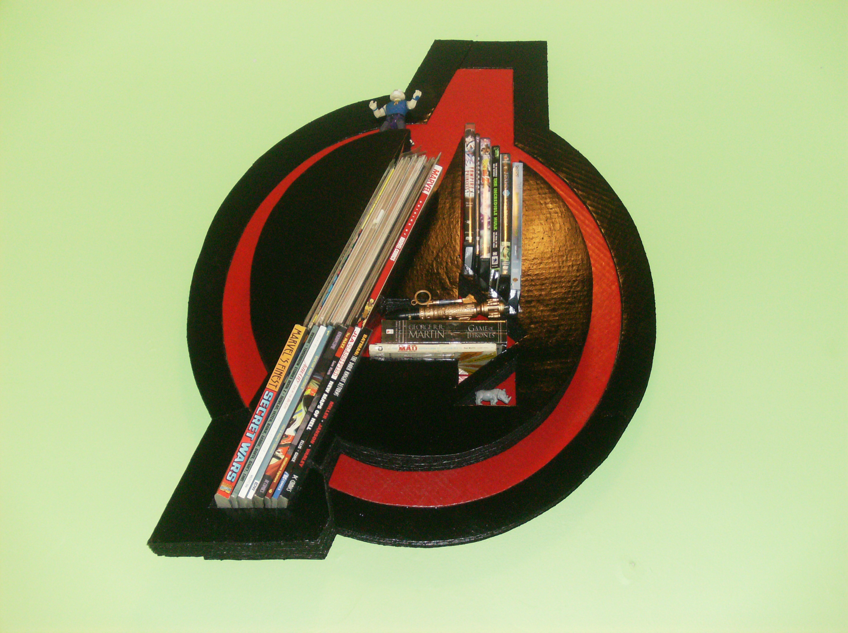 Since I am a collector of numerous comic books and proudly showcase them in my home, it felt fitting to craft a display for them as an homage to the larger-than-life essence of The Avengers. After some brainstorming, I settled upon the idea to make a bookcase/display-case resembling The Avengers logo.