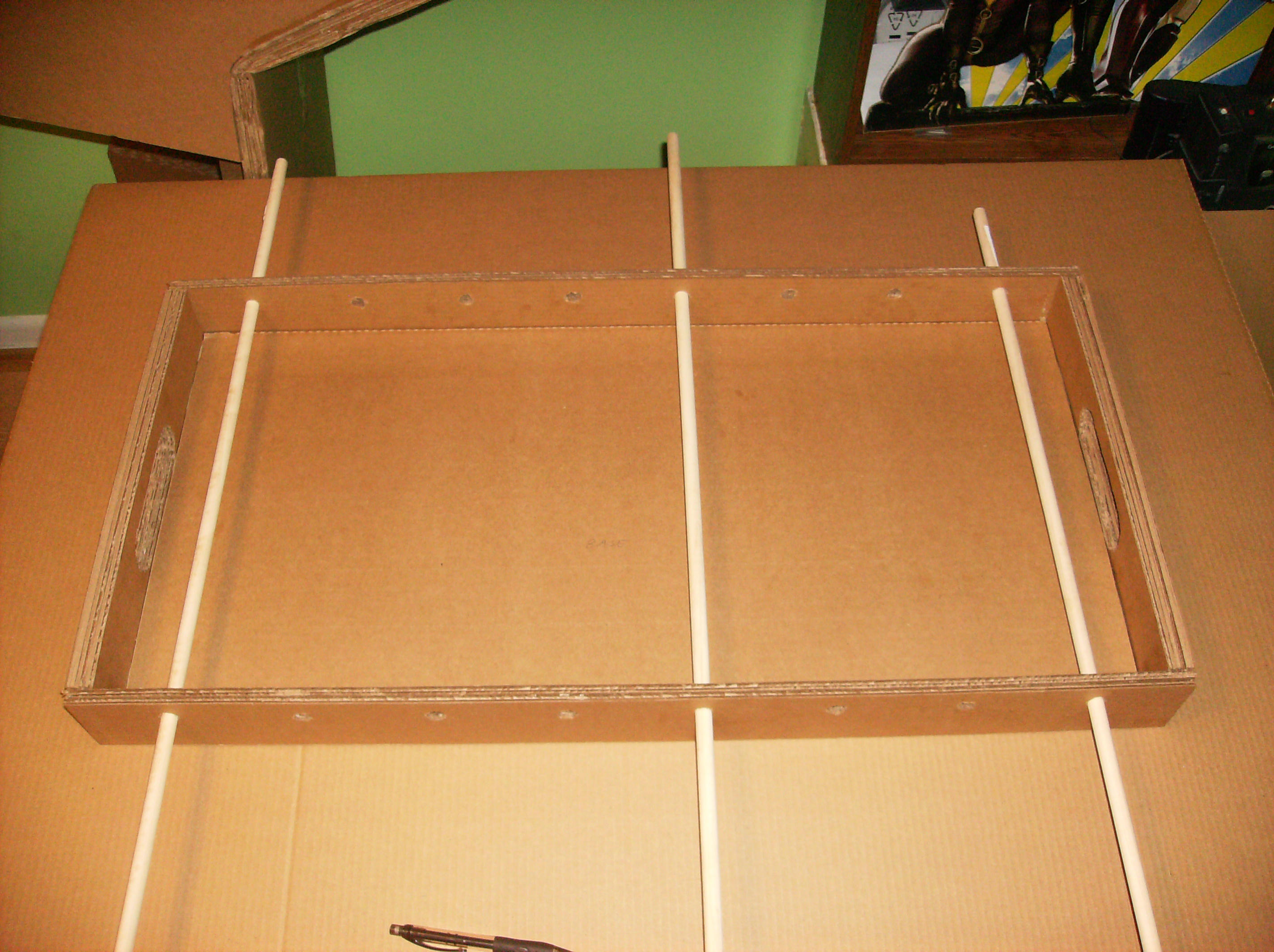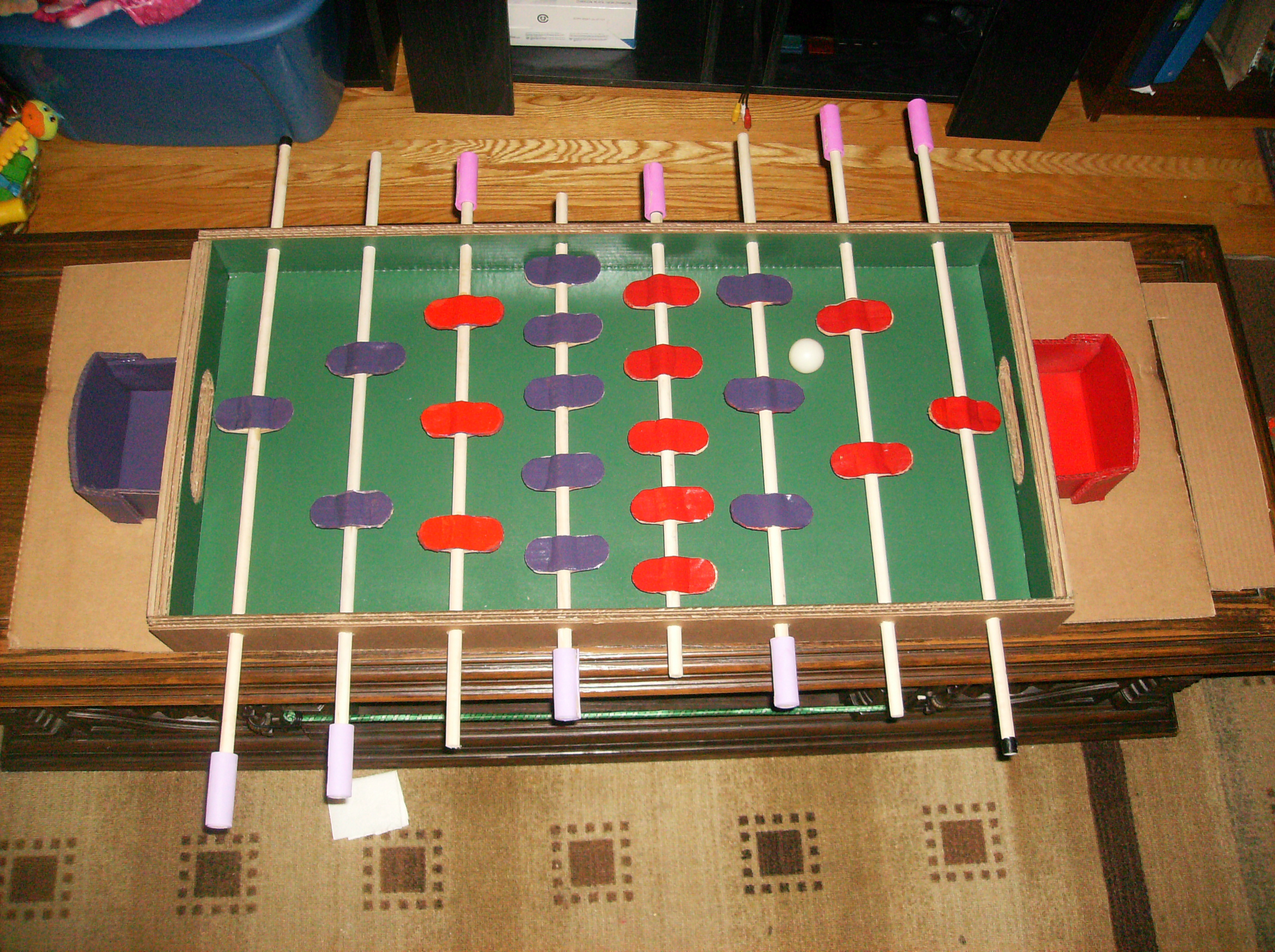As I have shown in past posts, cardboard is strong enough to become everything from swords to exercise equipment. With the right layering and gluing, a foosball table can be made within just one to two days with very basic inexpensive materials.