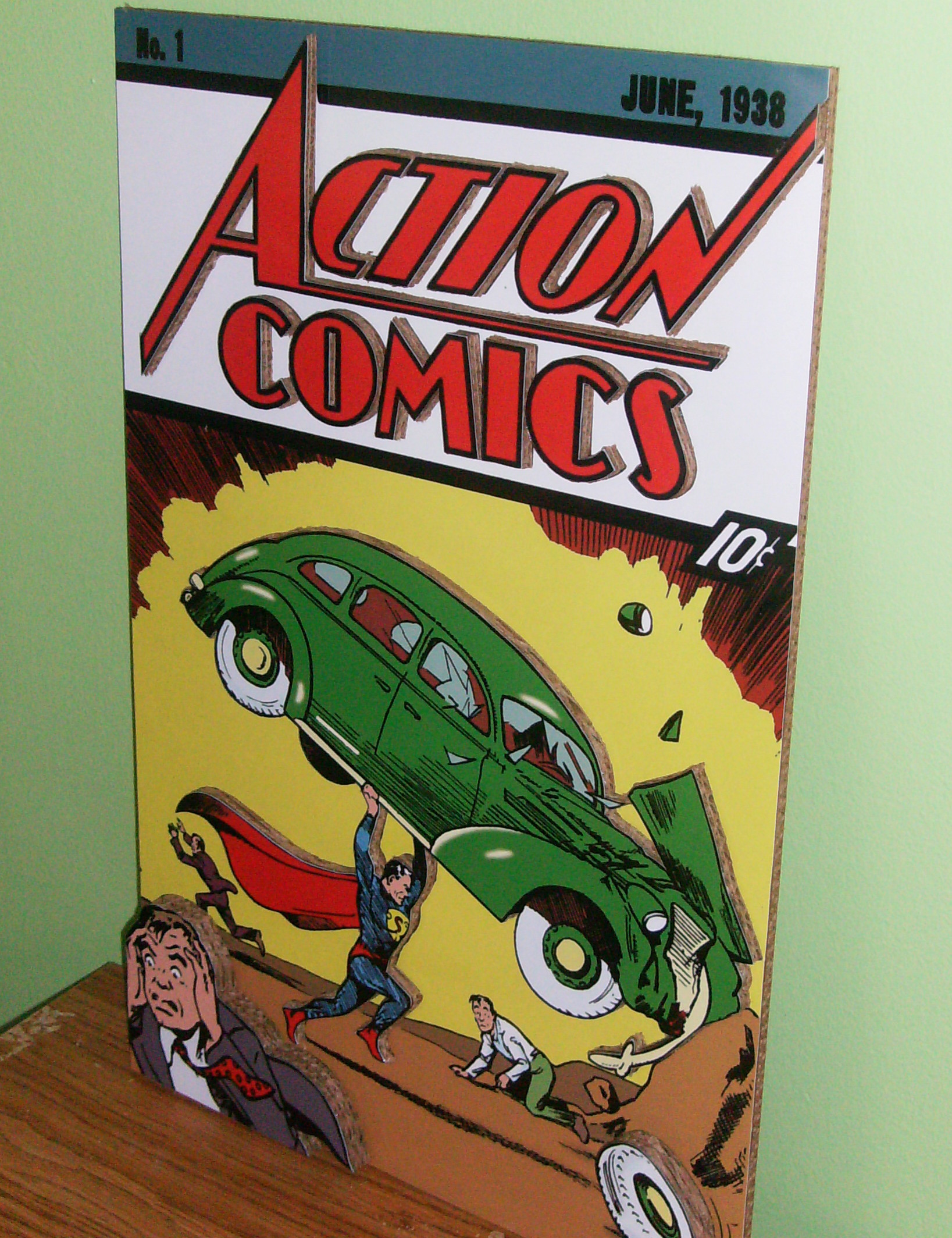 Each cover is roughly 235% larger than the original cover. The process involves making a clean and detailed poster-sized print of the cover, backing that image onto Bristol board to strengthen it, carefully cutting out each character and logo meant to stick out, tracing each cut-out onto cardboard, and gluing each cut-out onto their respective cardboard tracings. Once the glue dries and a string is attached on the backside, the works are ready for wall display.