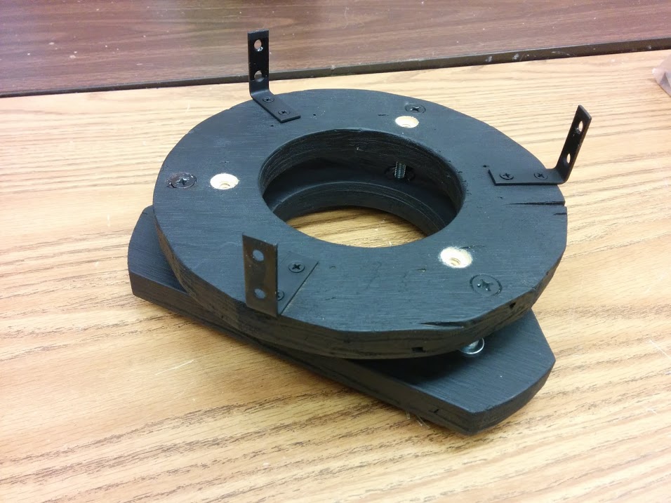 The telescope itself uses a 10 inch tube, normally used as a concrete mold for cement columns, as the main body. The inside of the tube as well as inside components of the telescope are blacked out to minimize any stray light, and the outside is painted a nice shade of blue. The tube supports are formed from wood and PVC, and a lazy Susan bearing is used on the bottom on top of a piece of plywood to easily traverse (adjust azimuth) across the sky.