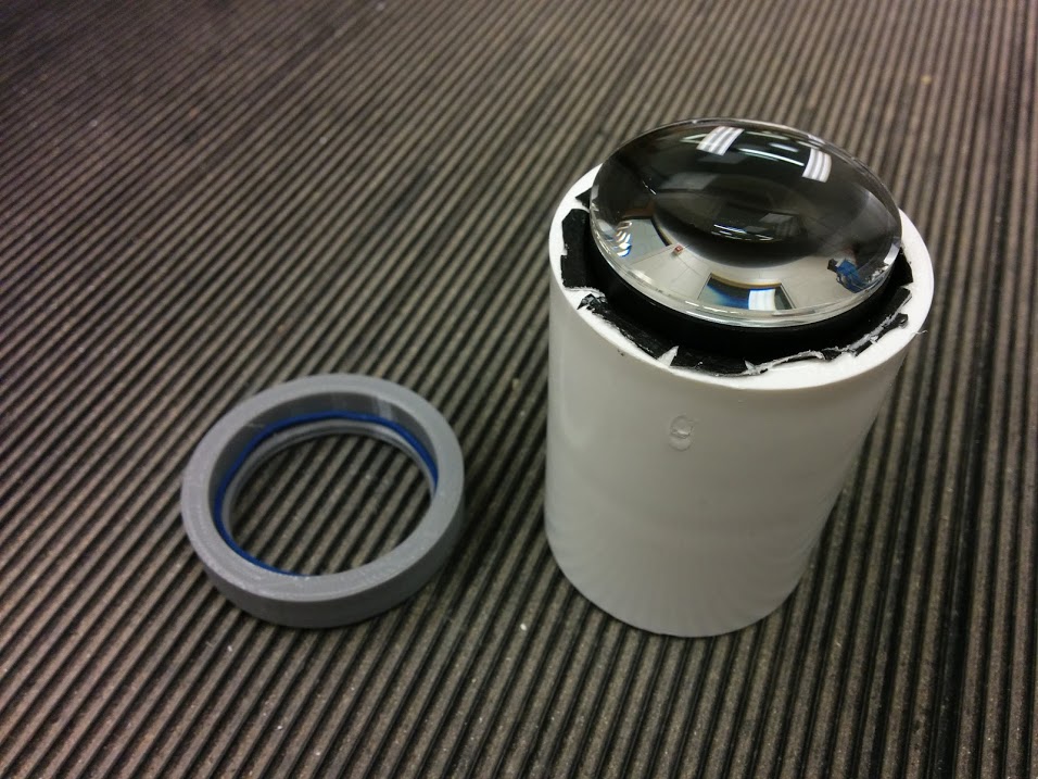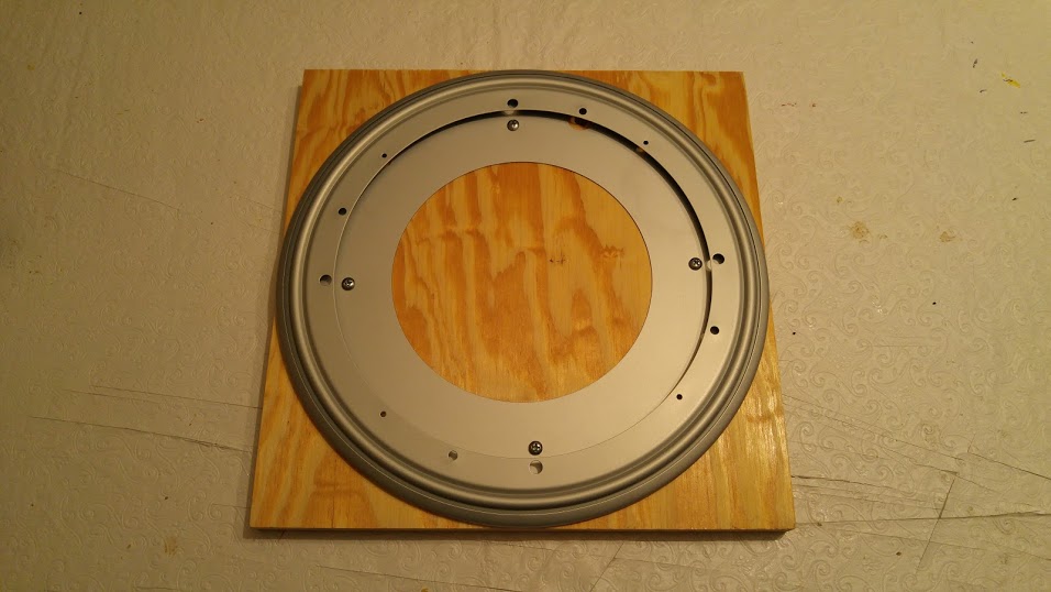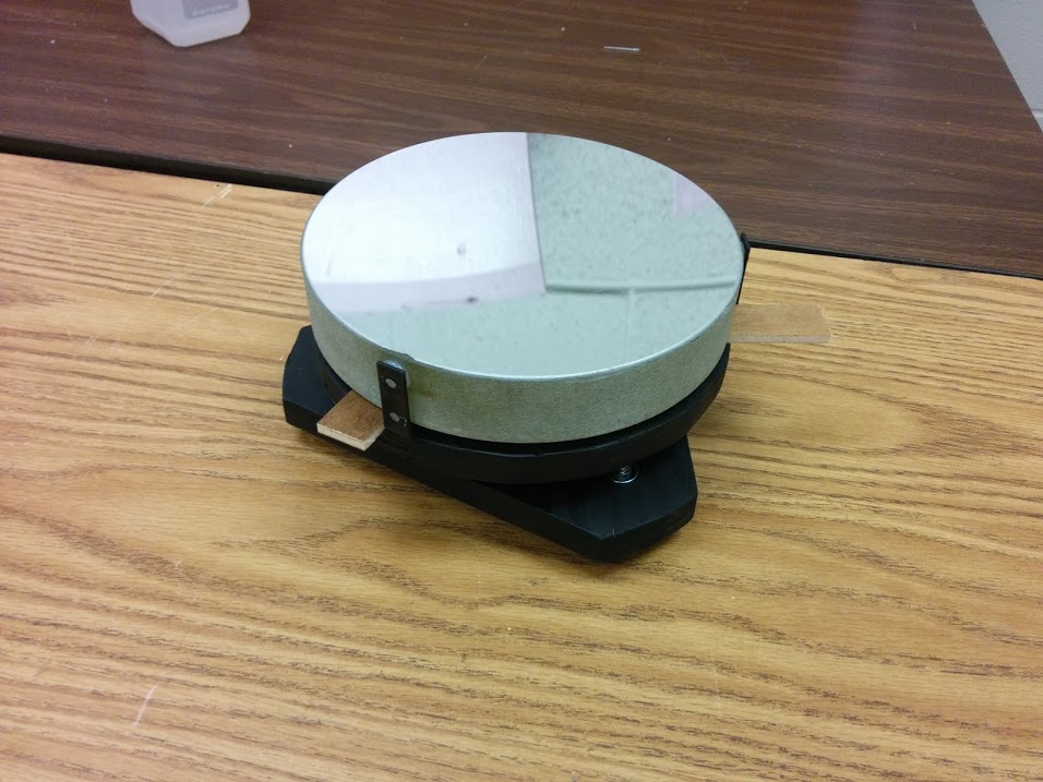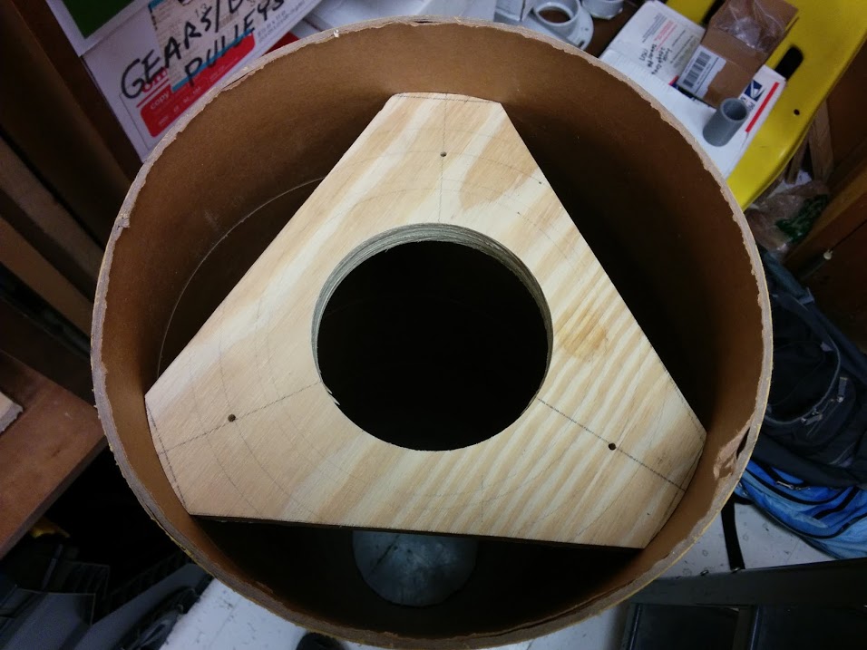 The telescope itself uses a 10 inch tube, normally used as a concrete mold for cement columns, as the main body. The inside of the tube as well as inside components of the telescope are blacked out to minimize any stray light, and the outside is painted a nice shade of blue. The tube supports are formed from wood and PVC, and a lazy Susan bearing is used on the bottom on top of a piece of plywood to easily traverse (adjust azimuth) across the sky.